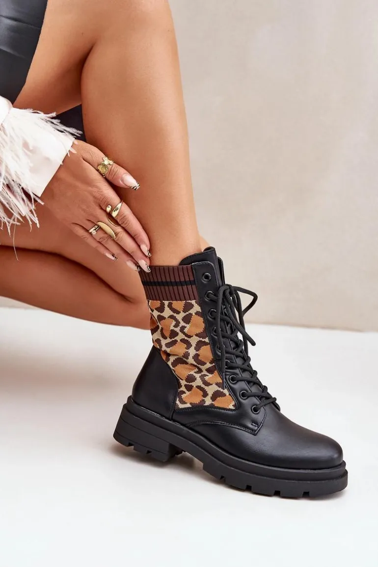 Botki damskie wykonane z połączenia eko skóry i tkaniny, ozdobione stylowym wzorem w panterkę. Model sznurowany z zaokrąglonymi noskami, co zapewnia wygodę i stabilność. Wnętrze ocieplane na wysokości stopy, idealne na chłodniejsze dni. Świetny wybór dla kobiet ceniących wygodę i modne akcenty. Przy wyborze rozmiaru prosimy sugerować się tabelą rozmiarów.