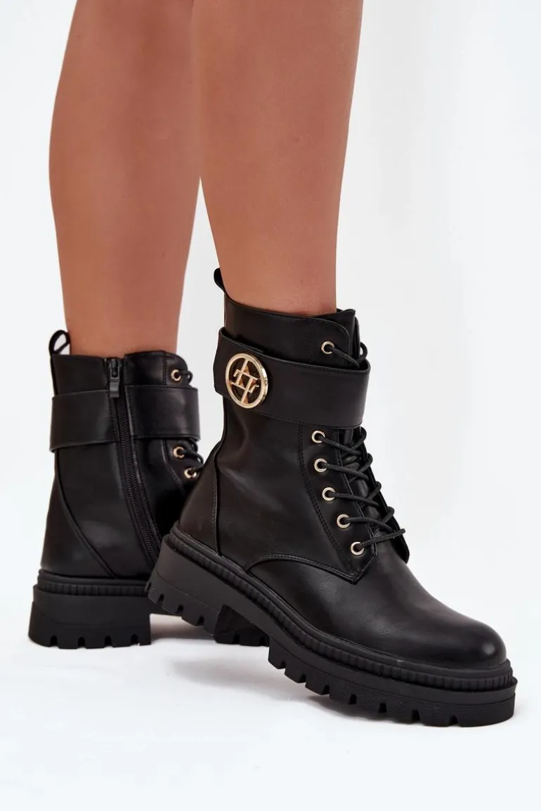 Botki damskie wykonane z eko skóry. Osadzone na platformie i płaskim obcasie, zapewniają komfort i stabilność na każdym kroku. Model zapinany na zamek i sznurowany pozwala na idealne dopasowanie do stopy. Z boku cholewki, na pasku znajduje się ozdobny złoty detal. Środek ocieplony futerkiem gwarantuje ciepło, sprawiając, że te botki będą doskonałym wyborem do zimowych stylizacji. Przy wyborze rozmiaru prosimy sugerować się tabelą rozmiarów.