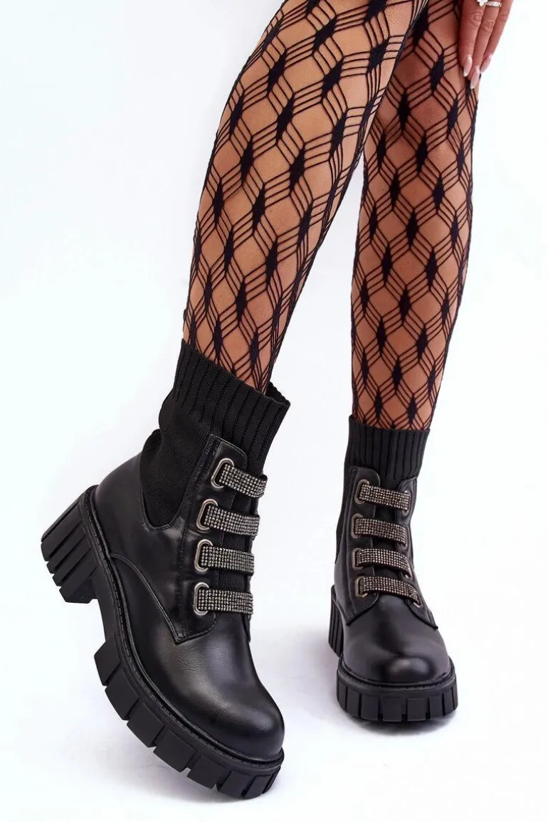 Botki damskie osadzone na płaskim obcasie i platformie. Wykonane z połączenia eko skóry i tkaniny. Z przodu znajdują się ozdobione małymi dżetami paski. Model wsuwany z elastyczną cholewką w formie skarpety. Ocieplenie kocem obuwniczym na wysokości stopy. Idealne do jesiennych stylizacji! Przy wyborze rozmiaru prosimy sugerować się tabelą rozmiarów.