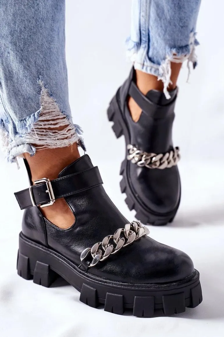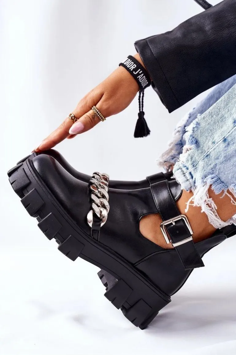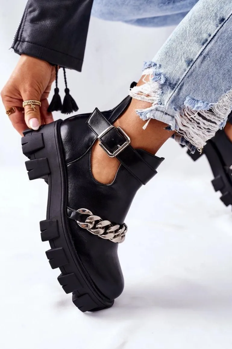 Botki damskie wykonane ze skóry ekologicznej z wycięciami. Przy wyborze rozmiaru prosimy sugerować się tabelą rozmiarów.