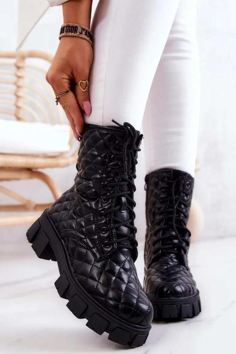 Botki świetnie sprawdzą się podczas tworzenia stylizacji w chłodniejsze dni. Pikowany materiał ze skóry ekologicznej to totalny must have w Twojej garderobie. Idealne do zwiewnych sukienek oraz spodni. Posiadają wiązanie oraz suwak. Dodatkowo do buta jest dołączona nerka zapinana na suwak na regulowanym pasku. Buty są ocieplane kocem obuwniczym. Przy wyborze rozmiaru prosimy sugerować się tabelą rozmiarów.