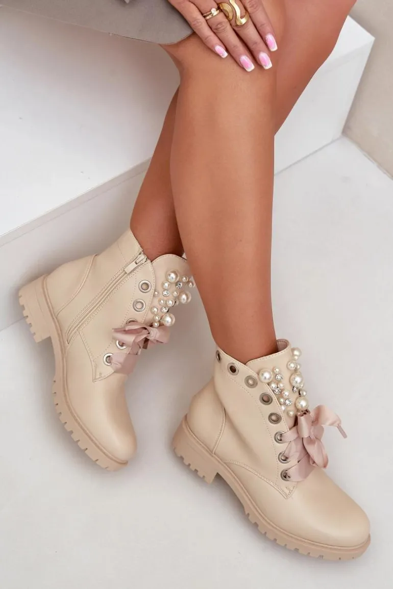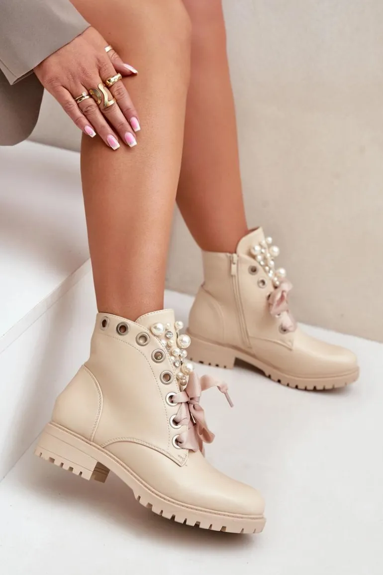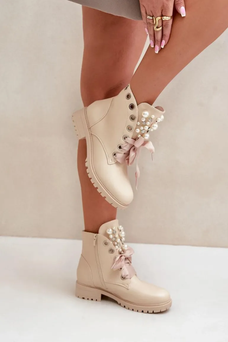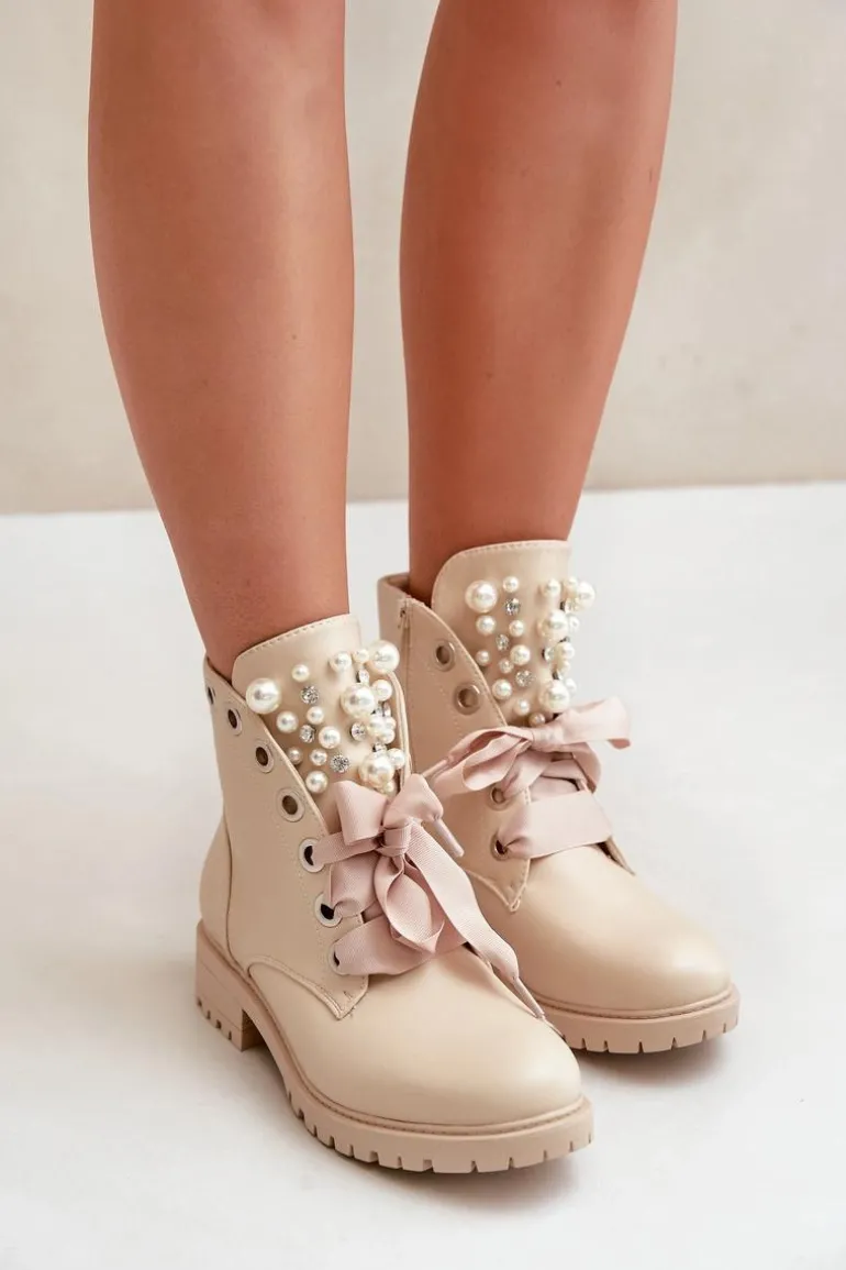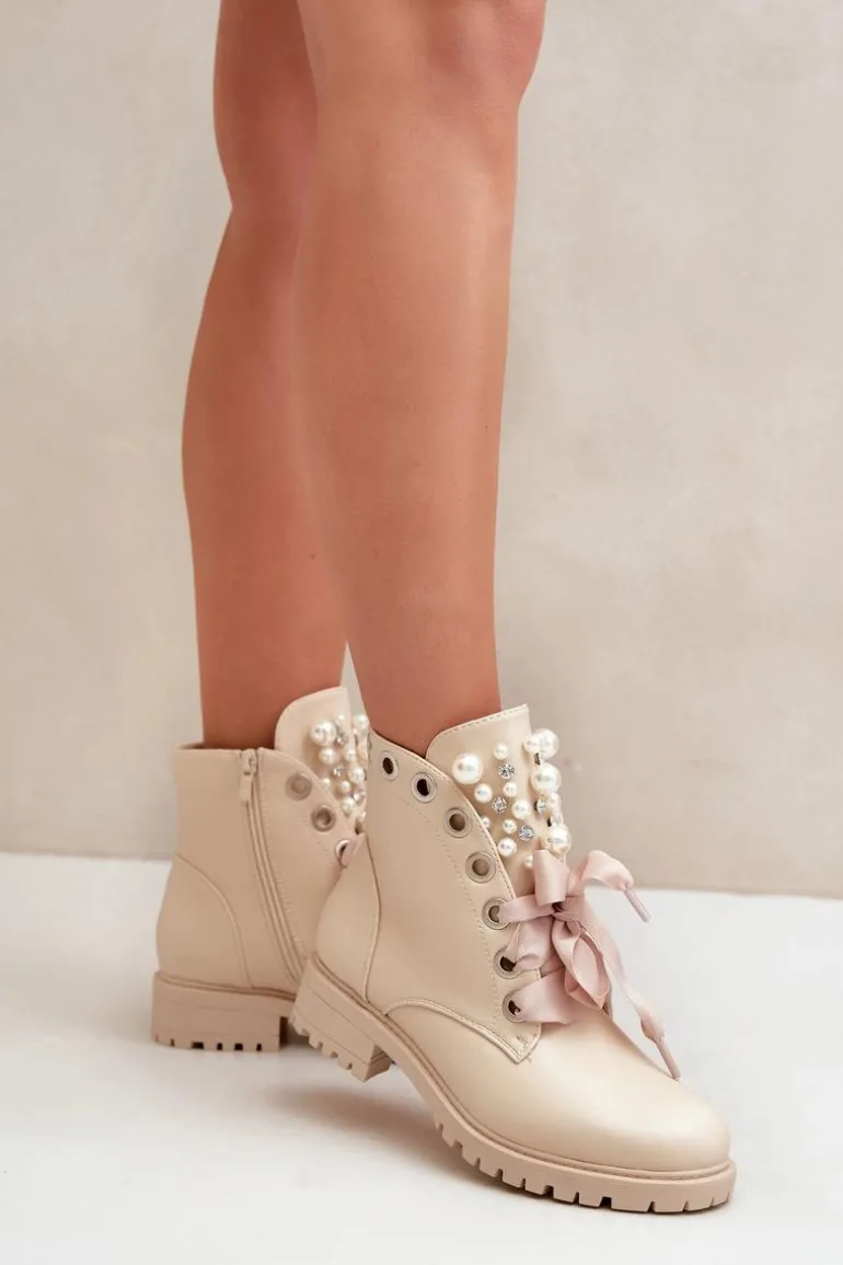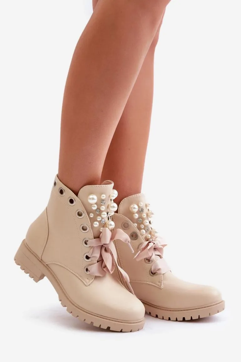 Damskie Skórzane Klapki Z Ozdobnymi Perełkami Beżowe Lasello