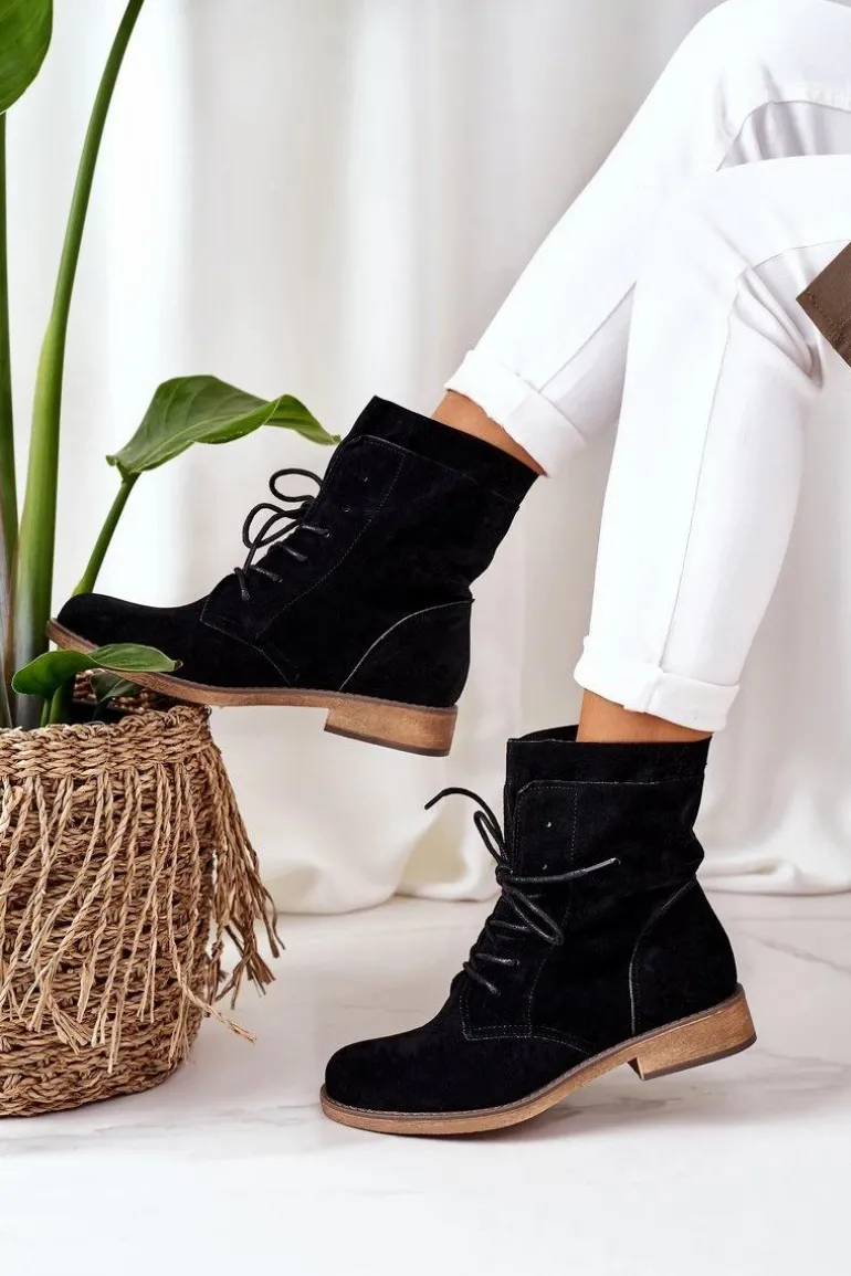 Botki damskie wykonane z eko zamszu z wyjątkową, podwójną cholewką. Wkładka jest ocieplana. Przy wyborze rozmiaru prosimy sugerować się tabelą rozmiarów.