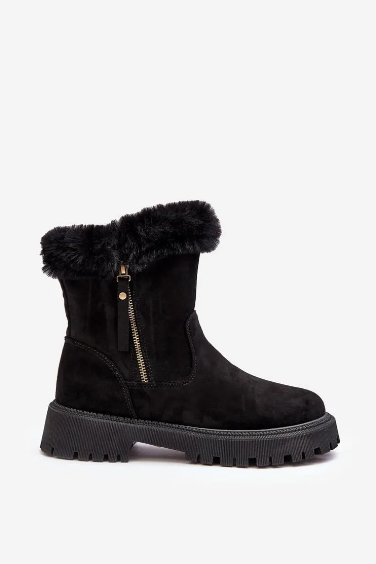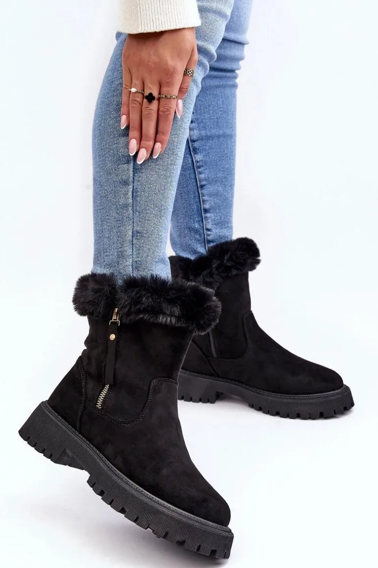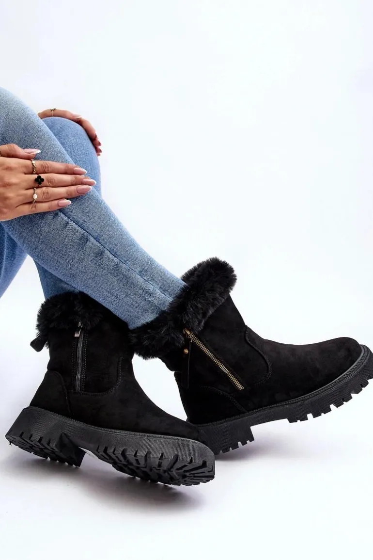 Botki z cholewką zakończoną miękkim futerkiem. Model ten posiada suwak z boku cholewki — jeden ozdobny, drugi ułatwiający zakładanie obuwia. Osadzone na płaskim obcasie i platformie. Ocieplone wewnątrz grubym futerkiem. Zapiętek jest usztywniany. Idealny model na chłodne dni! Przy wyborze rozmiaru prosimy sugerować się tabelą rozmiarów.