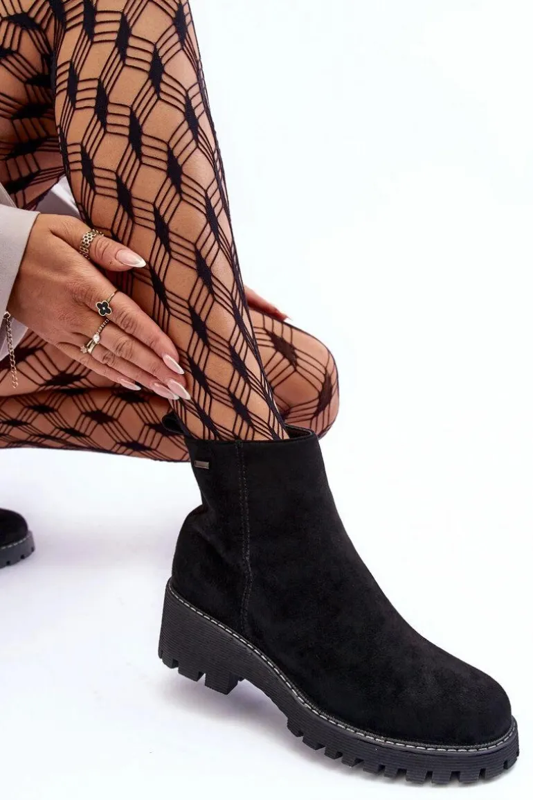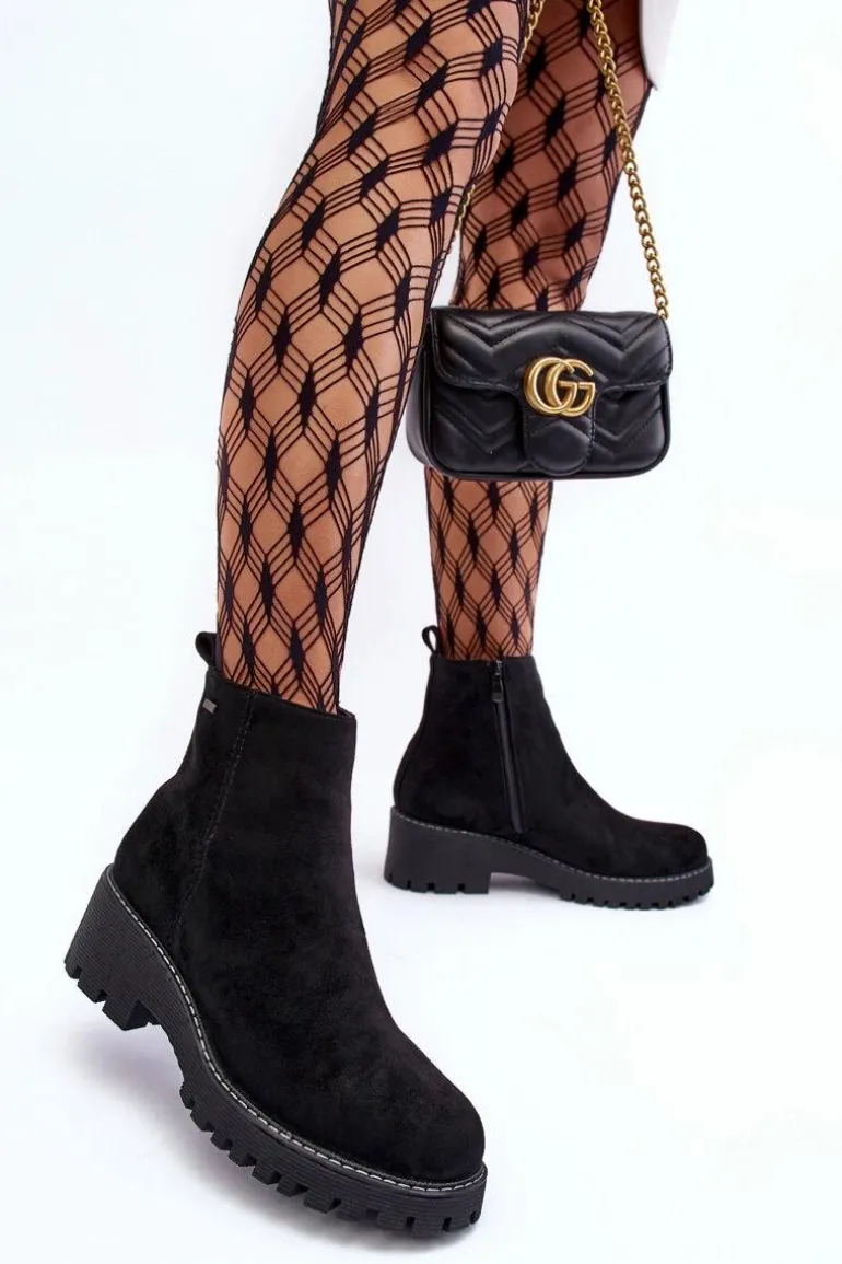 Klasyczne botki damskie osadzone na płaskim, stabilnym obcasie i platformie. Wykonane z eko zamszu. Zapinane na suwak po wewnętrznej stronie cholewki. Zapiętek jest usztywniony, noski zaokrąglone. Wnętrze ocieplone kocem obuwniczym. Świetny model na chłodniejsze dni! Przy wyborze rozmiaru prosimy sugerować się tabelą rozmiarów.