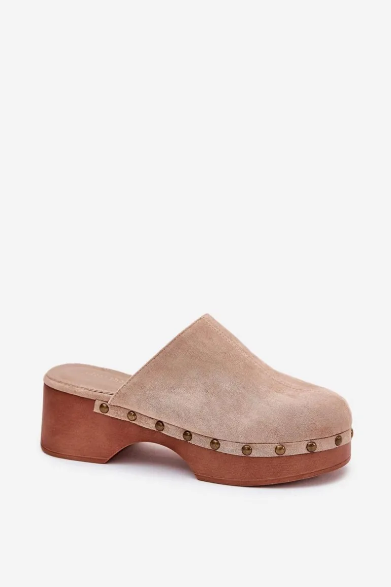 Lekkie klapki chodaki damskie wykonane z eko zamszu. Osadzone na platformie i koturnie. Ozdobione ćwiekami, które nadają im modnego i niepowtarzalnego charakteru. Wewnątrz znajduje się miękka eko skórzana wkładka, która gwarantuje komfort przez cały dzień. Klapki posiadają zakryte, zaokrąglone noski. Idealne na co dzień, doskonale komponują się z letnimi sukienkami, spódnicami i spodniami. Przy wyborze rozmiaru prosimy sugerować się tabelą rozmiarów.