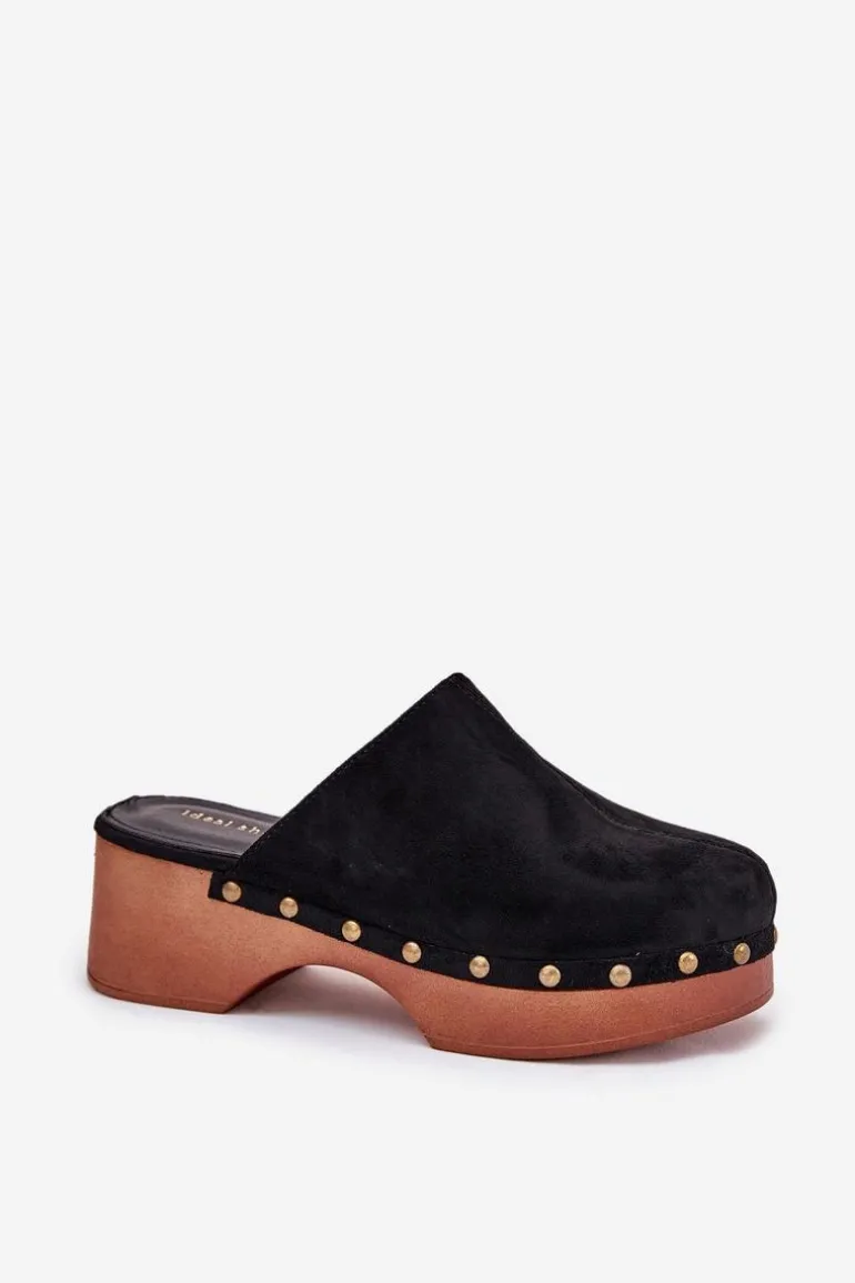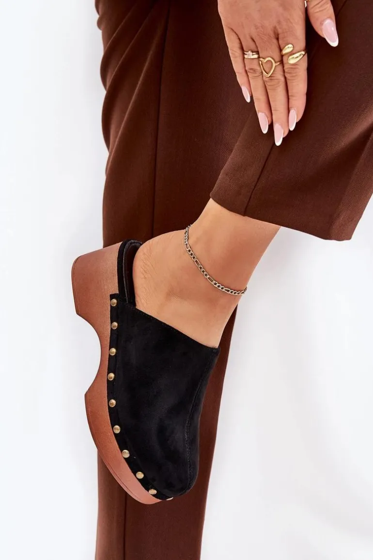 Lekkie klapki chodaki damskie wykonane z eko zamszu. Osadzone na platformie i koturnie. Ozdobione ćwiekami, które nadają im modnego i niepowtarzalnego charakteru. Wewnątrz znajduje się miękka eko skórzana wkładka, która gwarantuje komfort przez cały dzień. Klapki posiadają zakryte, zaokrąglone noski. Idealne na co dzień, doskonale komponują się z letnimi sukienkami, spódnicami i spodniami. Przy wyborze rozmiaru prosimy sugerować się tabelą rozmiarów.