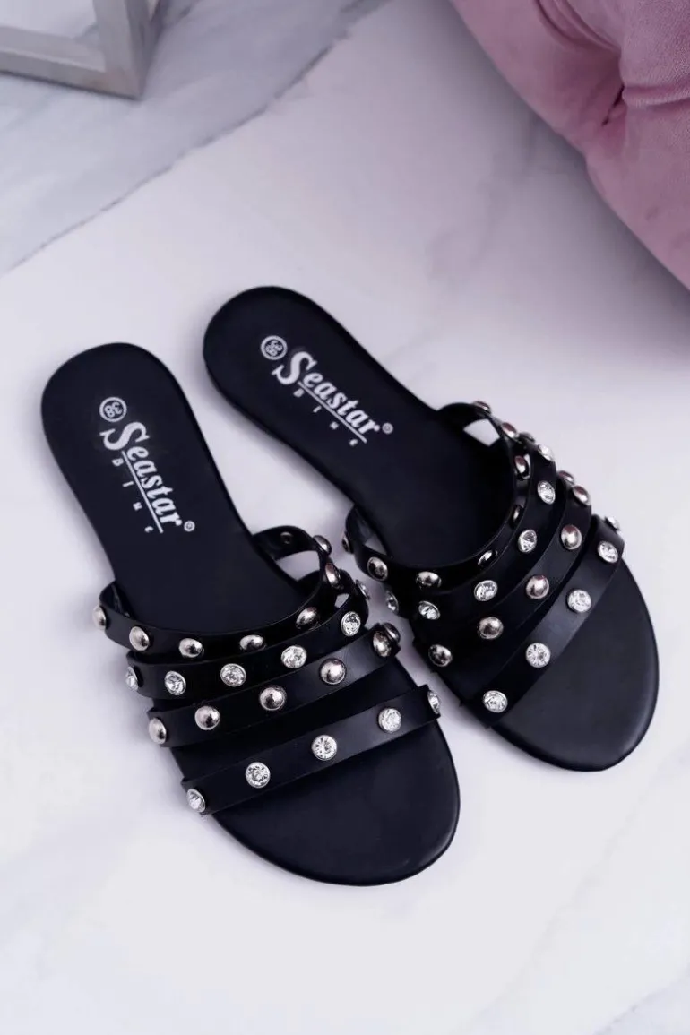 Czarne Damskie Klapki z Dżetami Kryształy Fergo