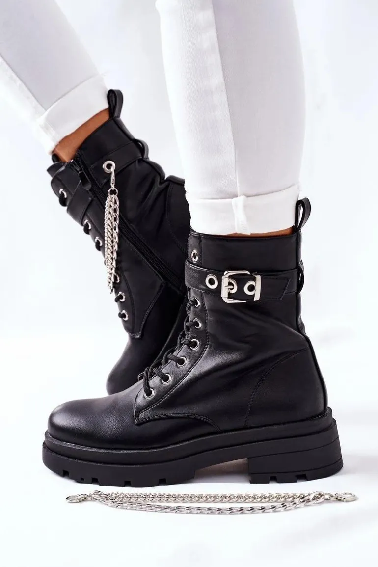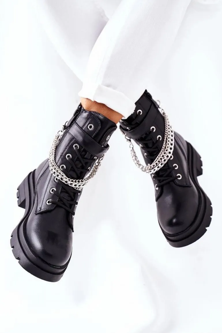 Niezwykłe i stylowe botki wykonane ze skóry ekologicznej. Zapinane na zamek oraz klamrę. Dodatkowy ozdobny łańcuch na cholewce. Przy wyborze rozmiaru prosimy sugerować się tabelą rozmiarów.