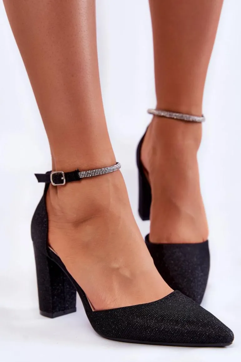 Modne czółenka na stabilnym obcasie w postaci słupka. Zapinane wokół kostki na regulowany pasek ozdobiony dżetami ze sprzączką. Model z noskiem w szpic. Buty te zostały wykonane z tkaniny, natomiast wkładka z eko skóry. Dodatkowo buty te posiadają usztywniany zapiętek. Idealne do wieczorowych sukienek czy eleganckich kombinezonów. Przy wyborze rozmiaru prosimy sugerować się tabelą rozmiarów.