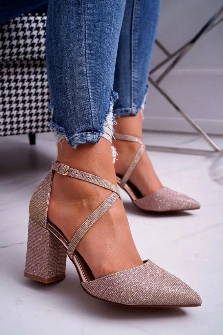 Wspaniałe czółenka na słupku, które idealnie wpasują się w nasze wieczorowe stylizacje. Brokatowy pyłek nadaje im niesamowitego uroku. Delikatny słupek oraz zapinanie wokół kostki z możliwością regulacji. Postaw na elegancki styl i wybierz te cudowne czółenka. Przy wyborze rozmiaru prosimy sugerować się tabelą rozmiarów.