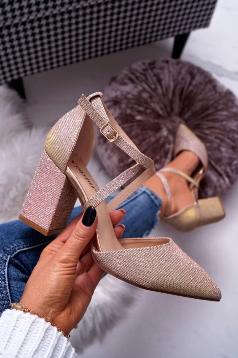Czółenka Damskie Na Słupku Brokatowe Champagne Perset