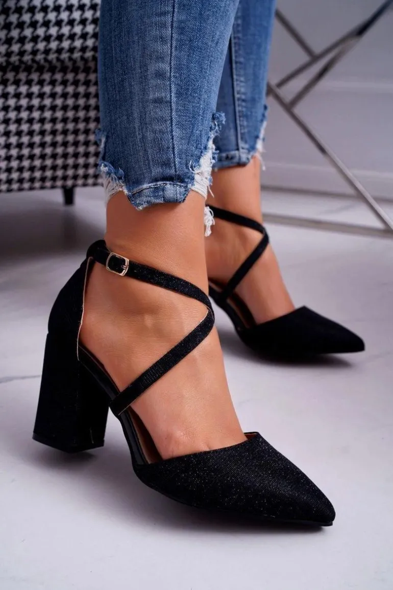 Czółenka Damskie Na Słupku Brokatowe Czarne Trever