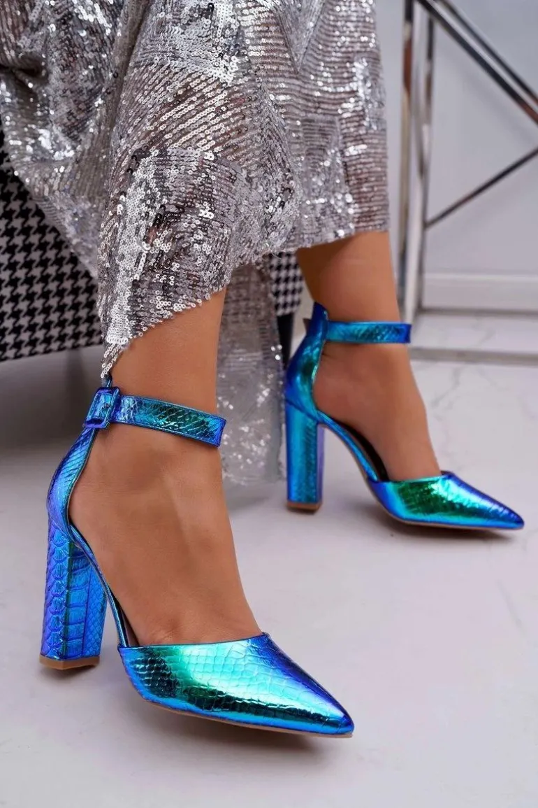 Czółenka Damskie Na Słupku Opalizujące Niebieskie Magnetic