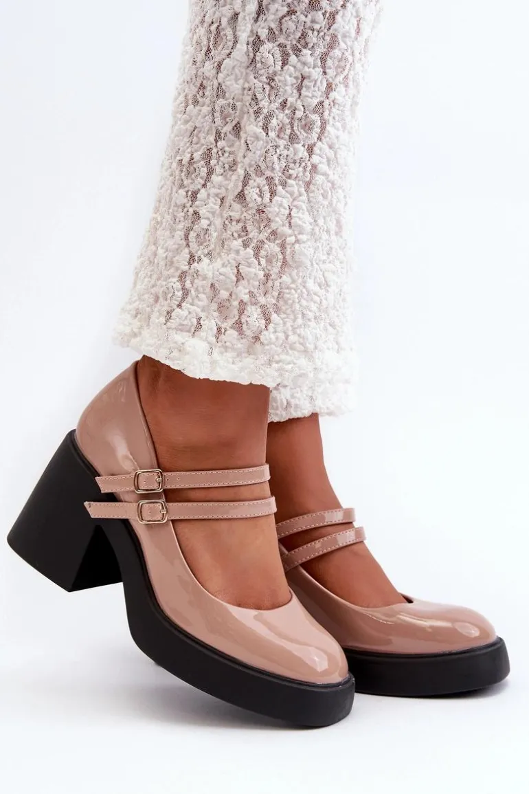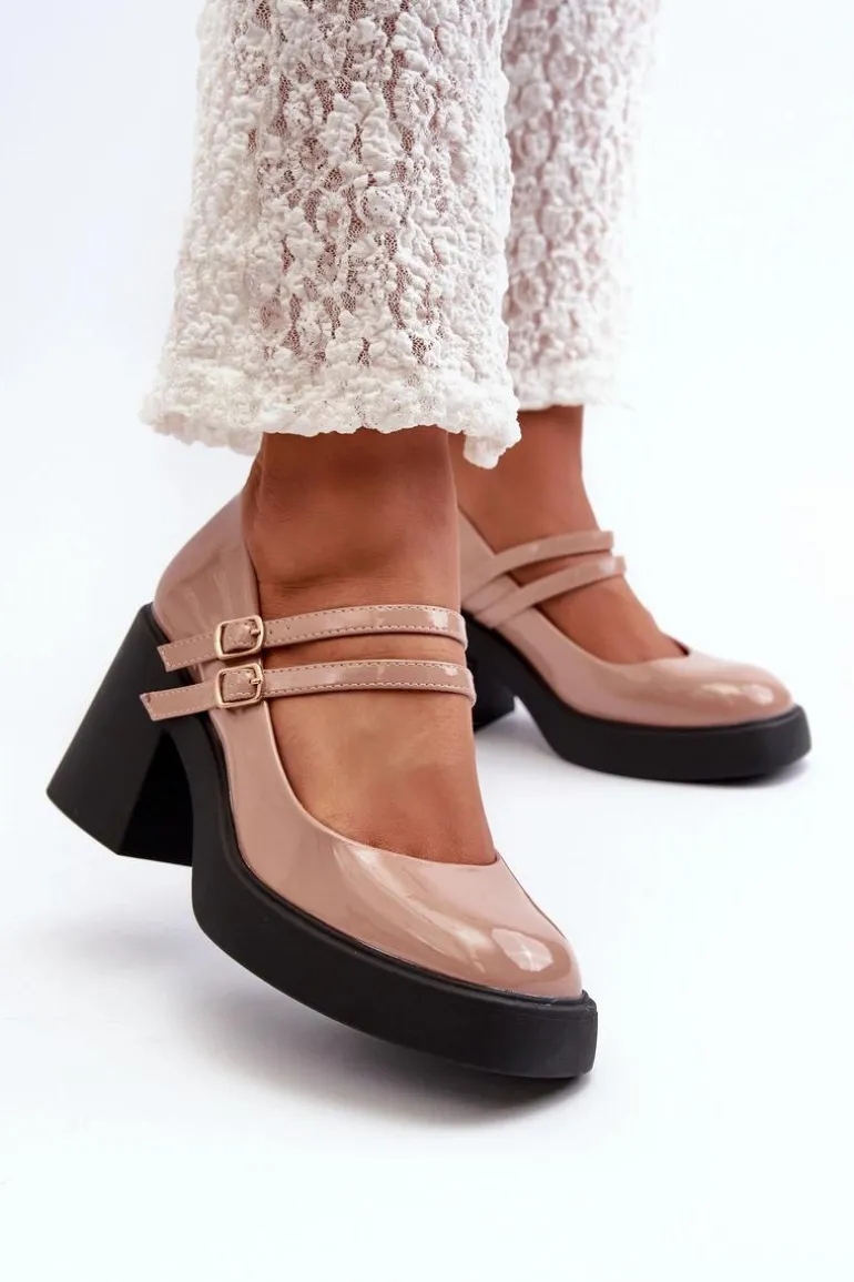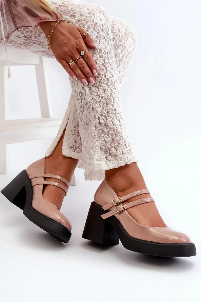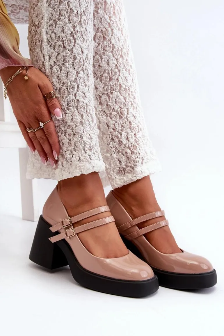 Czółenka wykonane ze skóry ekologicznej. Zapinane na dwa regulowane, cienkie, paseczki. Osadzone na masywnym, wyższym obcasie w postaci klocka. Zapiętek jest usztywniany, a nosek kwadratowy. Dodatkowo buty posiadają delikatną platformę. Ten modny fason koniecznie musi być Twój! Przy wyborze rozmiaru prosimy sugerować się tabelą rozmiarów.