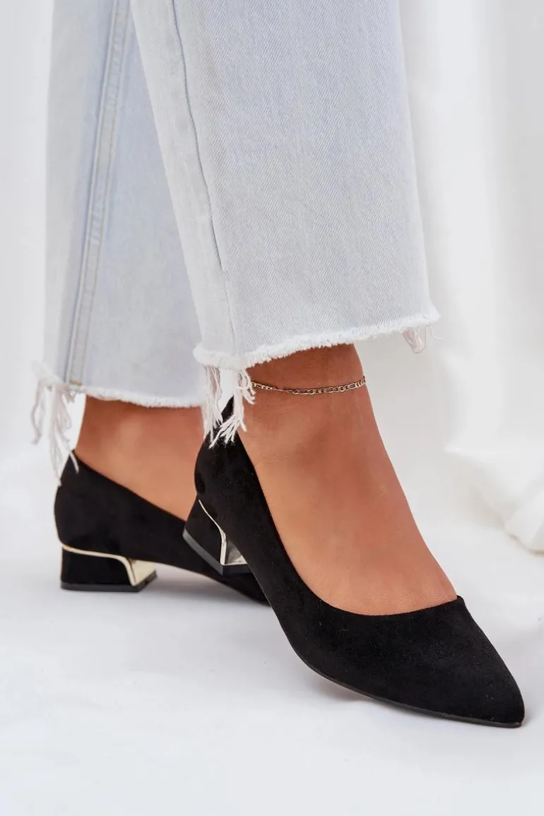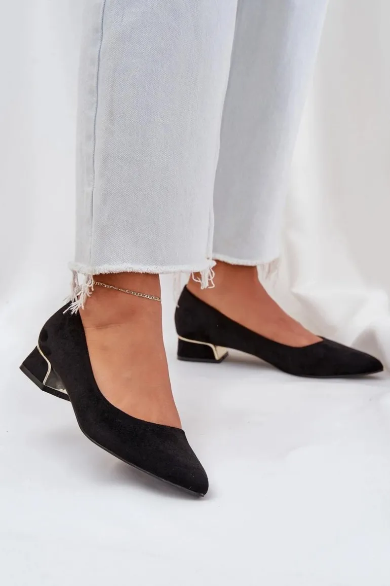 Eko zamszowe czółenka na niskim obcasie to elegancka propozycja dla kobiet ceniących komfort i styl. Szpiczaste noski nadają im wyrafinowanego charakteru, a złoty element na obcasie dodaje subtelnego blasku i podkreśla całość. Niski obcas zapewnia wygodę przez cały dzień, idealnie komponując się zarówno z codziennymi, jak i bardziej eleganckimi stylizacjami. To idealny wybór na każdą okazję, łączący nowoczesny design z klasyczną elegancją. Przy wyborze rozmiaru prosimy sugerować się tabelą rozmiarów.