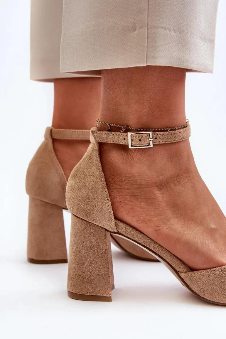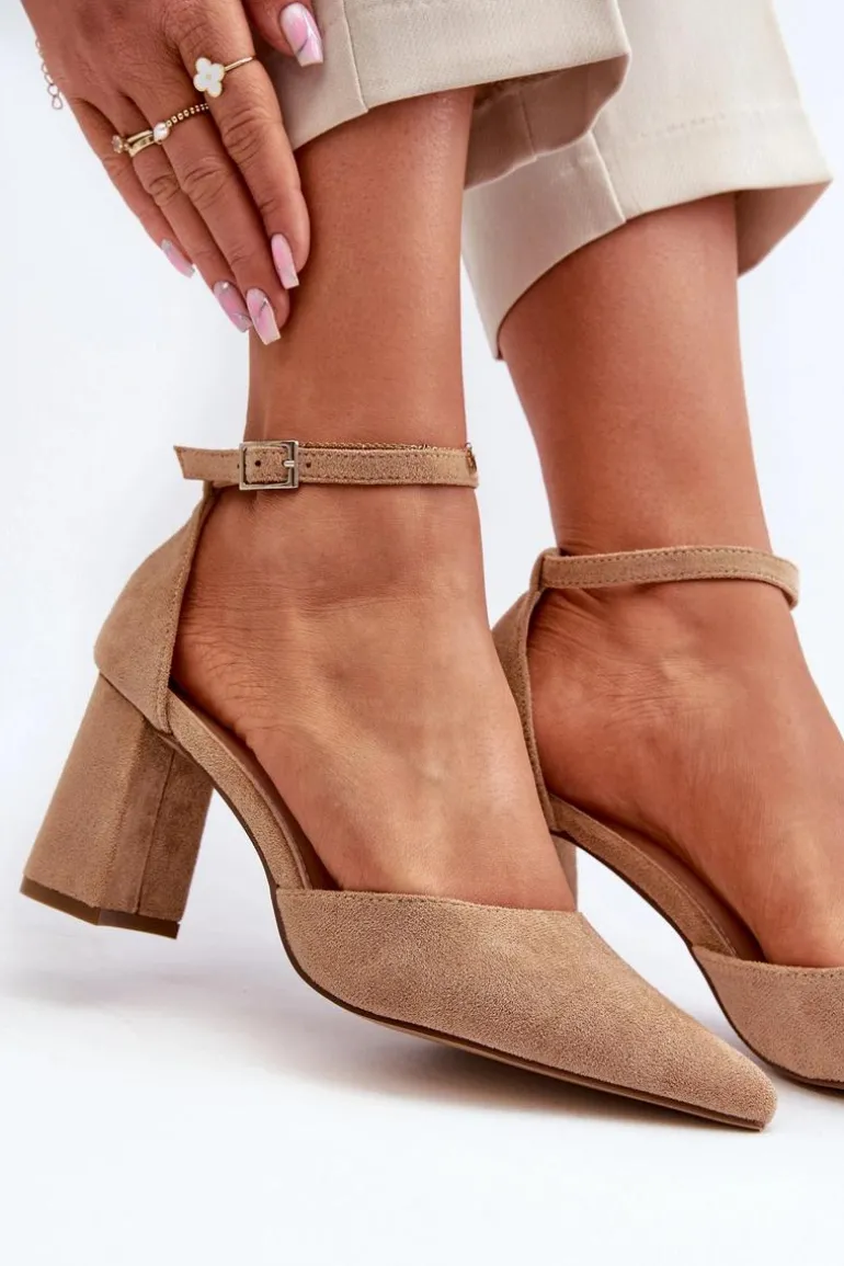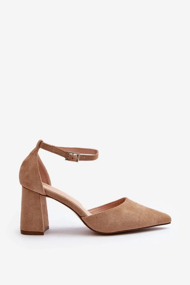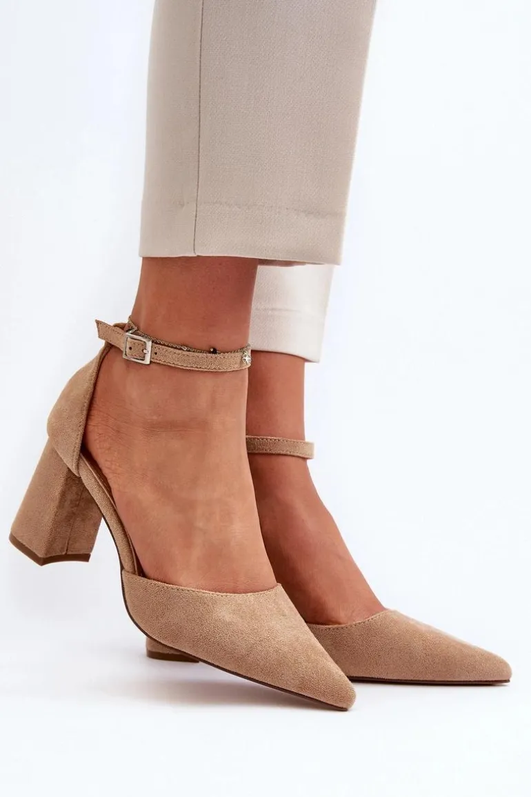 Stylowe czółenka damskie na obcasie w postaci słupka. Wykonane z eko zamszu. Noski w szpic optycznie wysmuklą nogi, a zapinanie na regulowany pasek ze sprzączką zapewni doskonałe dopasowanie. Idealne na wieczorne wyjścia oraz różne uroczystości rodzinne! Przy wyborze rozmiaru prosimy kierować się tabelą rozmiarów