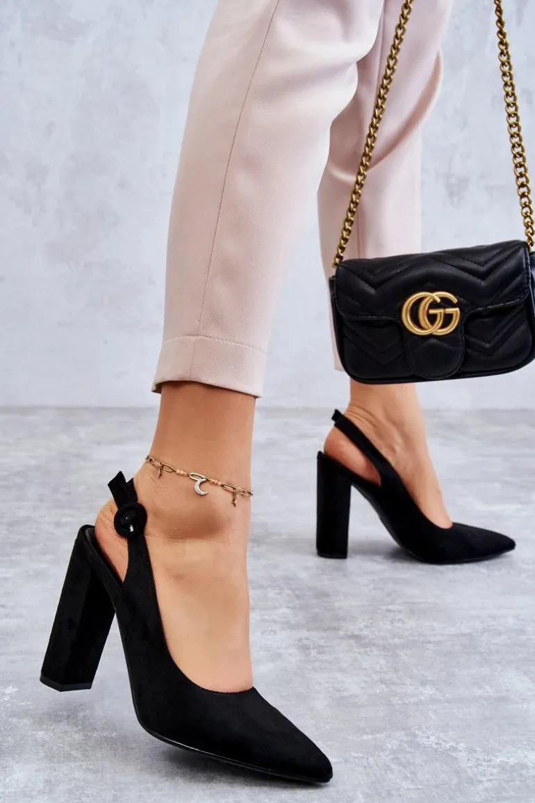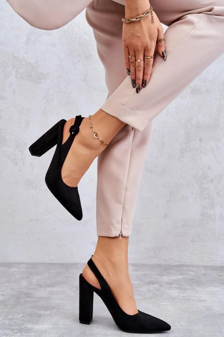 Modne czółenka na stabilnym obcasie w postaci słupka. Zapinane wokół kostki na regulowany pasek ze sprzączką. Model z noskiem w szpic. Buty te zostały wykonane z eko zamszu, natomiast wkładka z eko skóry. Dodatkowo posiadają odkrytą piętę. Idealne na wiele okazji. Przy wyborze rozmiaru prosimy sugerować się tabelą rozmiarów.