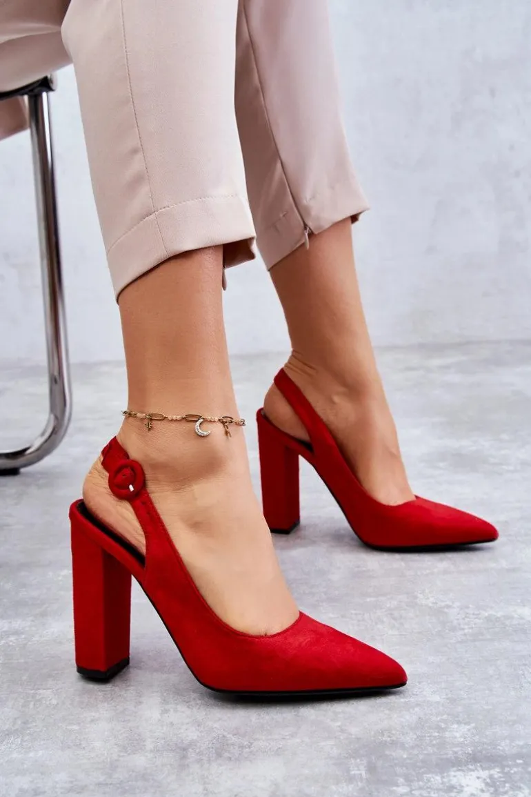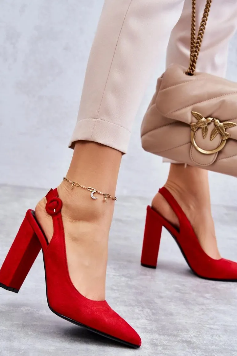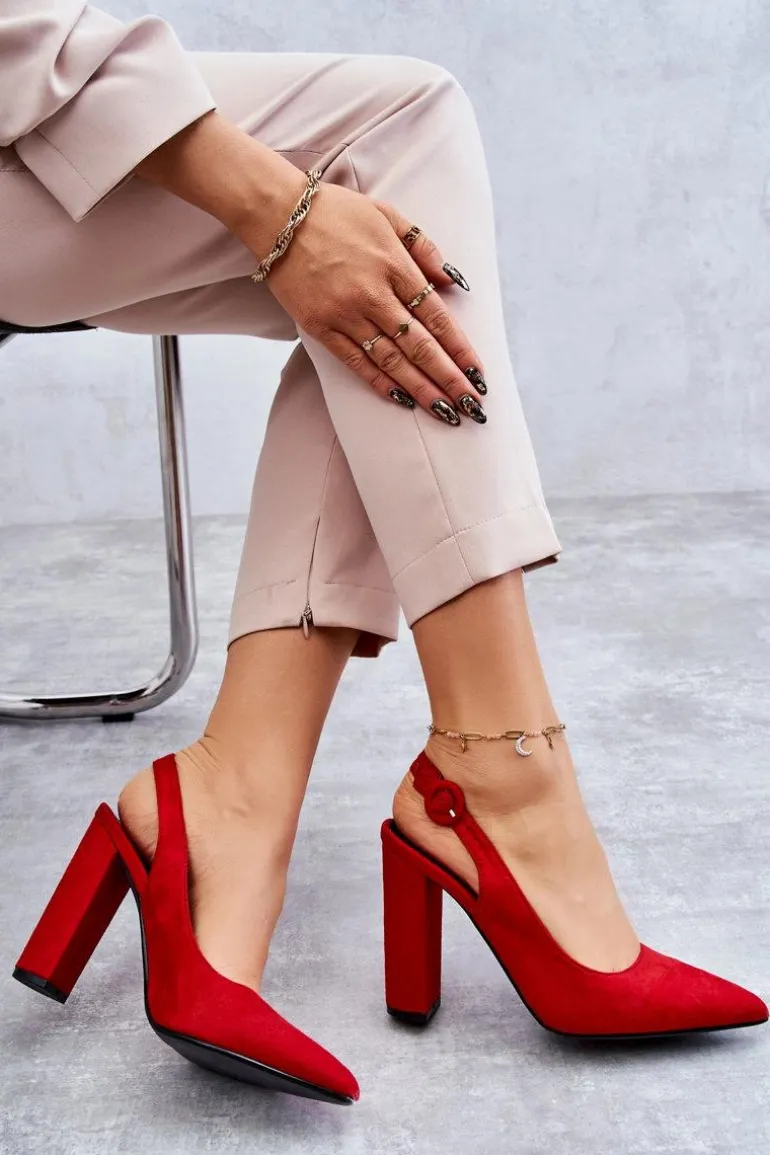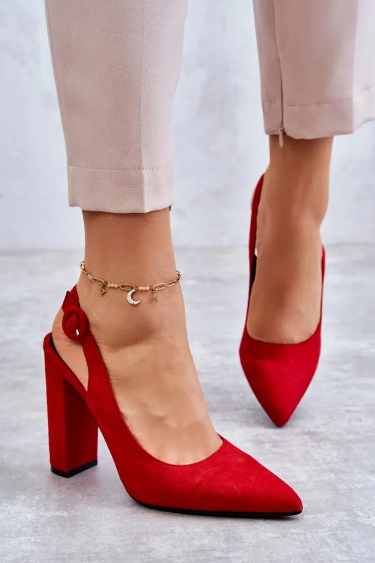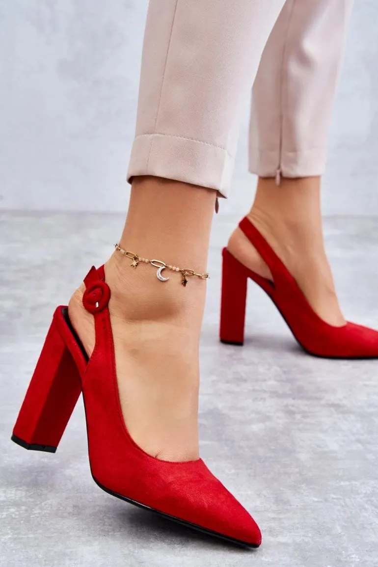 Modne czółenka na stabilnym obcasie w postaci słupka. Zapinane wokół kostki na regulowany pasek ze sprzączką. Model z noskiem w szpic. Buty te zostały wykonane z eko zamszu, natomiast wkładka z eko skóry. Dodatkowo posiadają odkrytą piętę. Idealne na wiele okazji. Przy wyborze rozmiaru prosimy sugerować się tabelą rozmiarów.