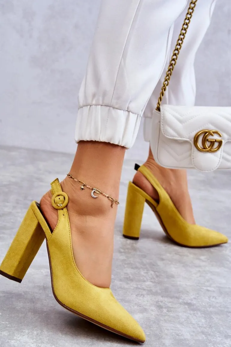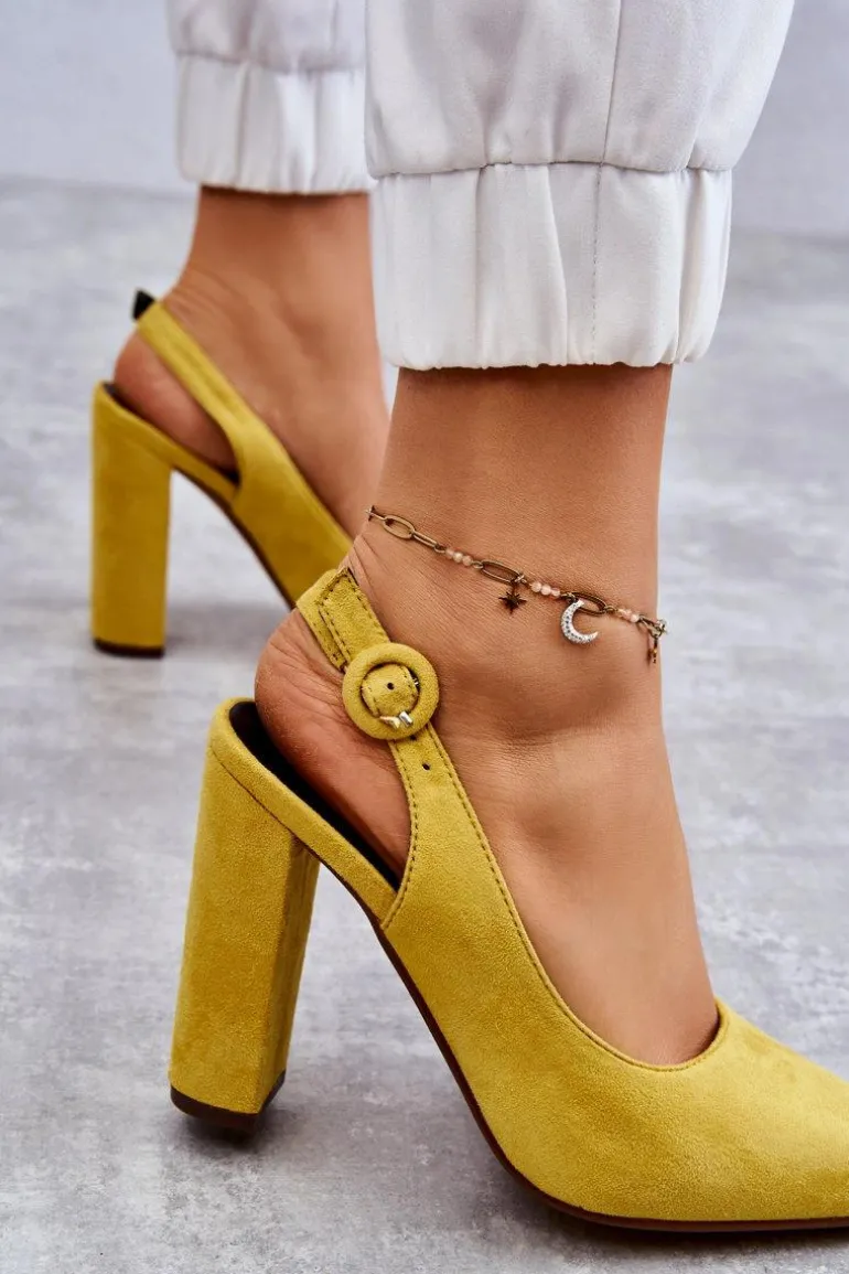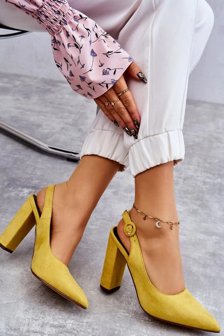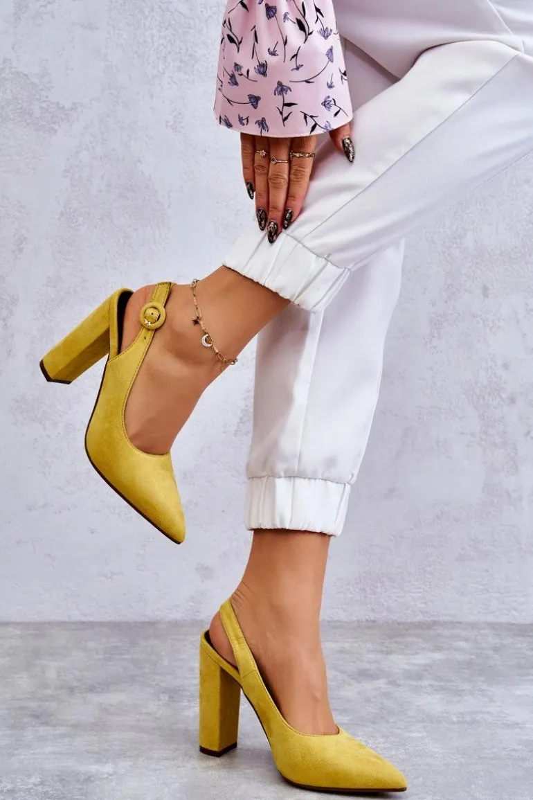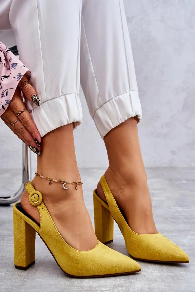 Modne czółenka na stabilnym obcasie w postaci słupka. Zapinane wokół kostki na regulowany pasek ze sprzączką. Model z noskiem w szpic. Buty te zostały wykonane z eko zamszu, natomiast wkładka z eko skóry. Dodatkowo posiadają odkrytą piętę. Idealne na wiele okazji. Przy wyborze rozmiaru prosimy sugerować się tabelą rozmiarów.
