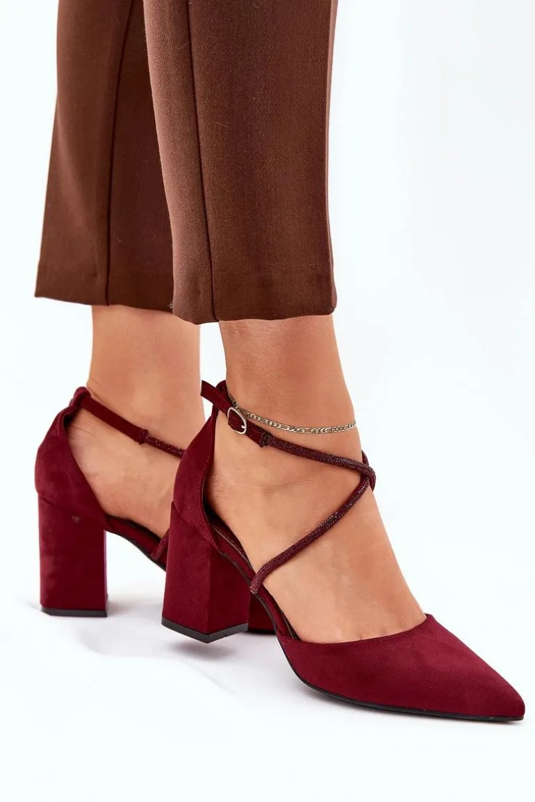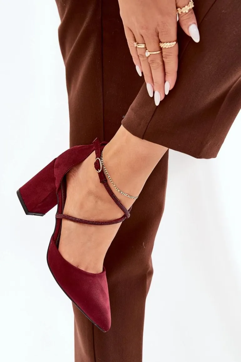 Czółenka damskie wykonane z eko zamszu. Osadzone na obcasie typu słupek. Model ten wyróżnia się przeplatającymi paseczkami, które ozdobione zostały cyrkoniami, które z pewnością przyciągną uwagę i nadają wyjątkowego blasku. Noski w szpic podkreślają ich elegancki wygląd, a zapinane na sprzączkę, zapewniają idealne dopasowanie do stopy. Te czółenka będą doskonałym wyborem na specjalne okazje, dodając każdej stylizacji szyku i odrobiny glamour. Przy wyborze rozmiaru prosimy sugerować się tabelą rozmiarów.