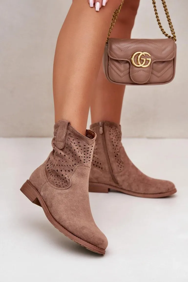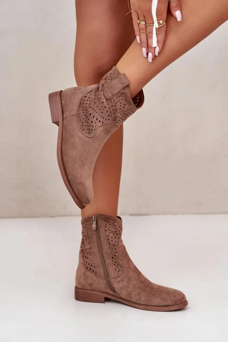 Ażurowe botki damskie idealnie dopełnią niemalże każdą codzienną stylizację! Wykonane z eko zamszu. Osadzone na płaskim, stabilnym obcasie. Noski zaokrąglone. Cholewka przed kolano, zapinana na zamek. Dodatkowo model ten posiada usztywniany zapiętek. Koniecznie powinnaś je mieć! Przy wyborze rozmiaru prosimy sugerować się tabelą rozmiarów.