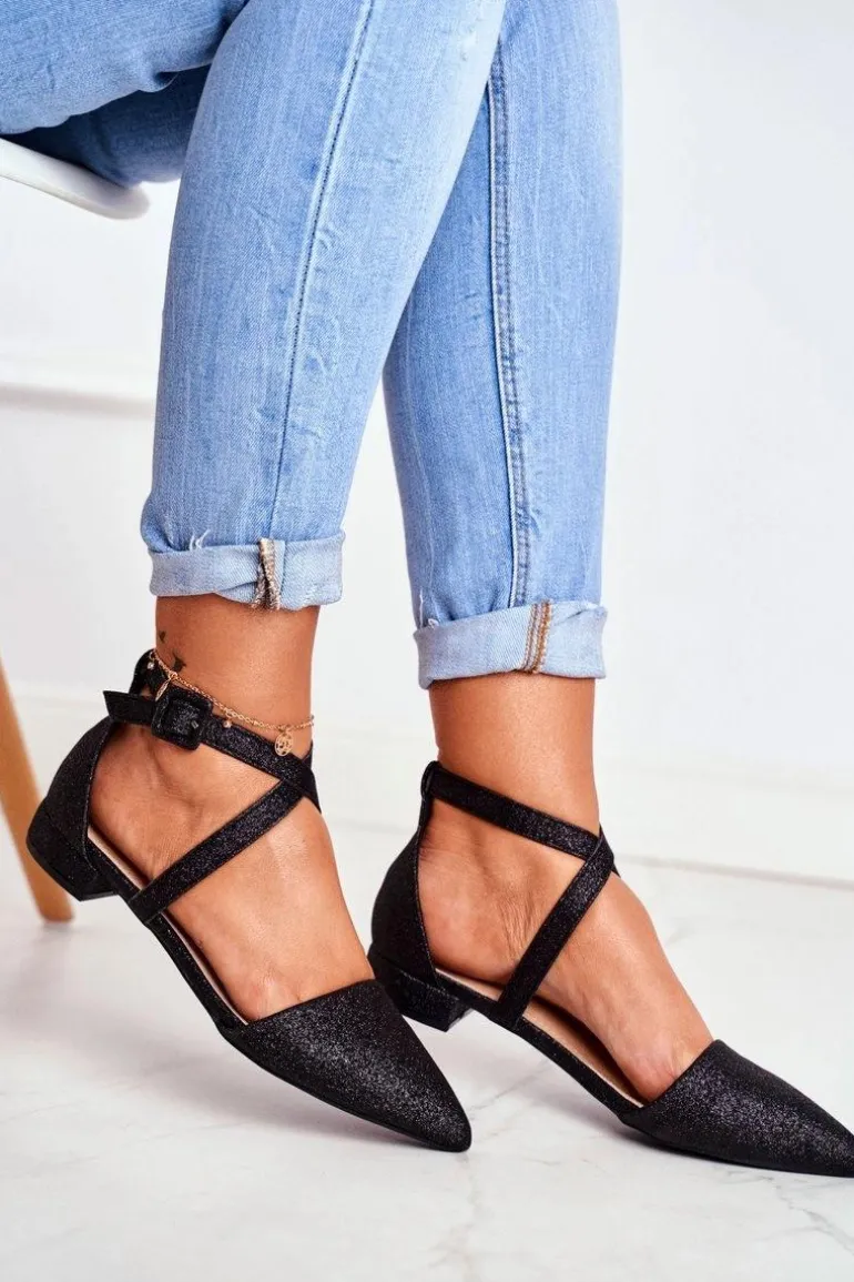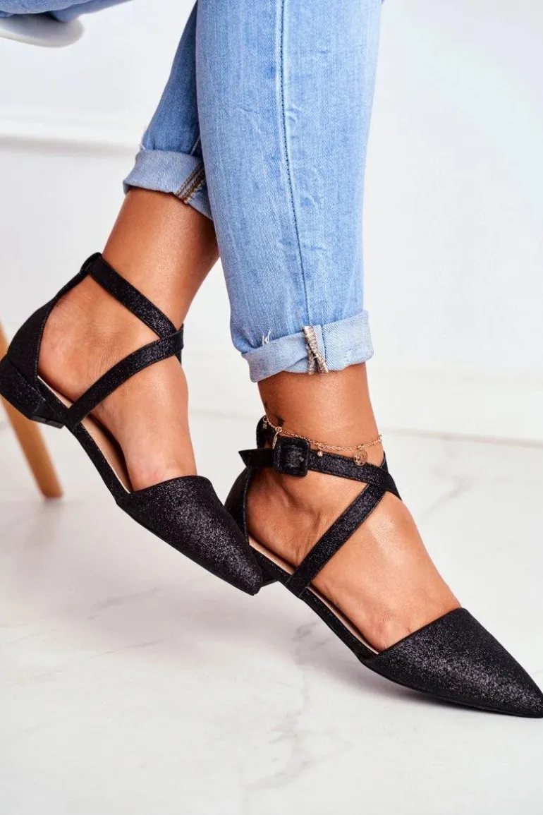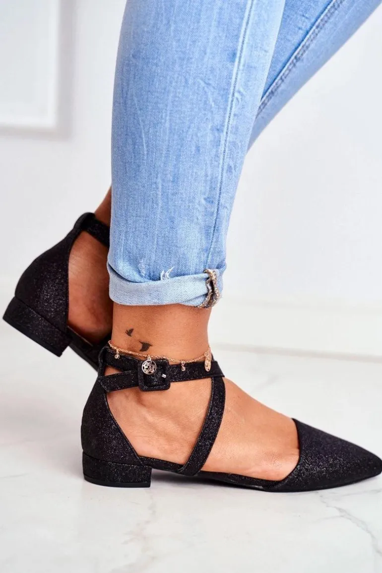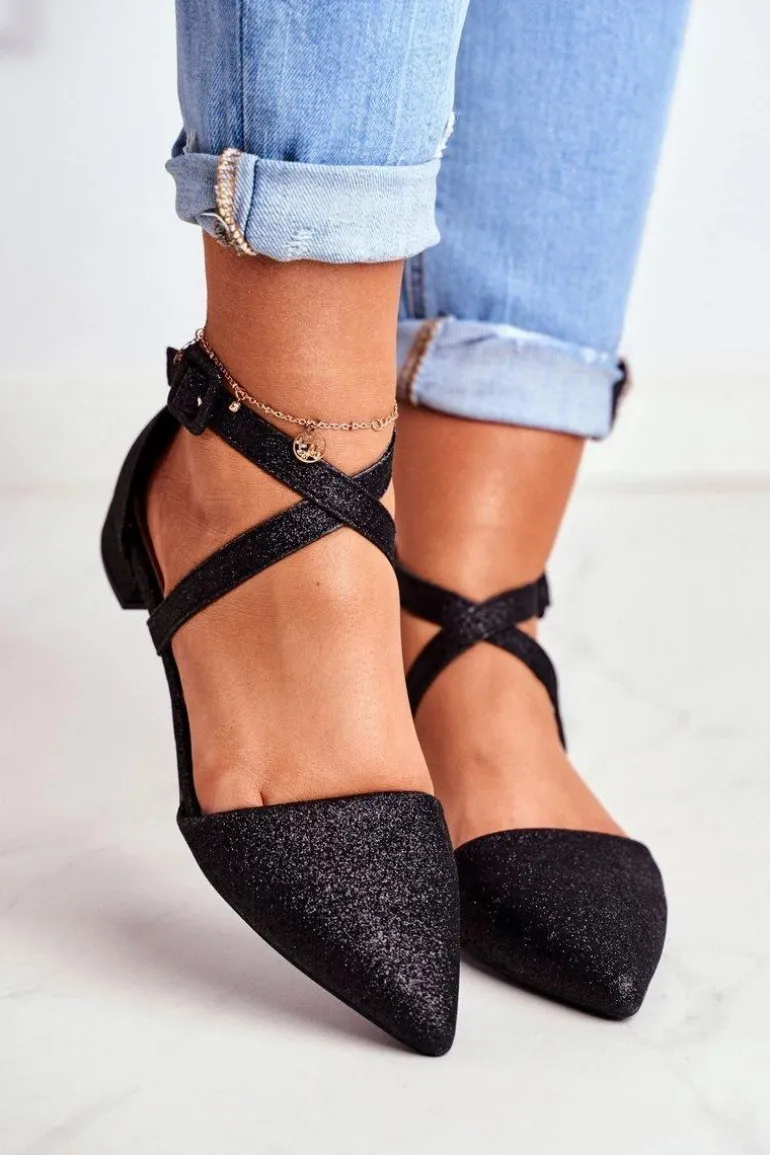 Damskie Balerinki Brokatowe w Szpic Czarne Vontare