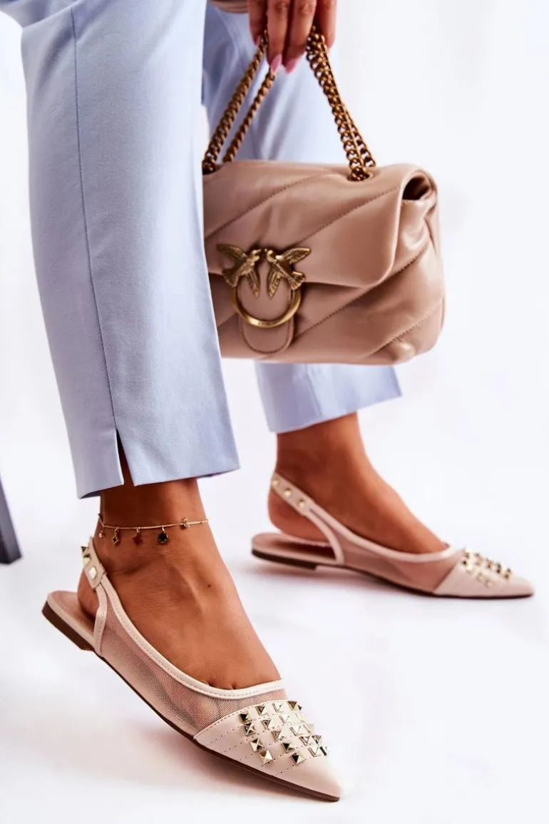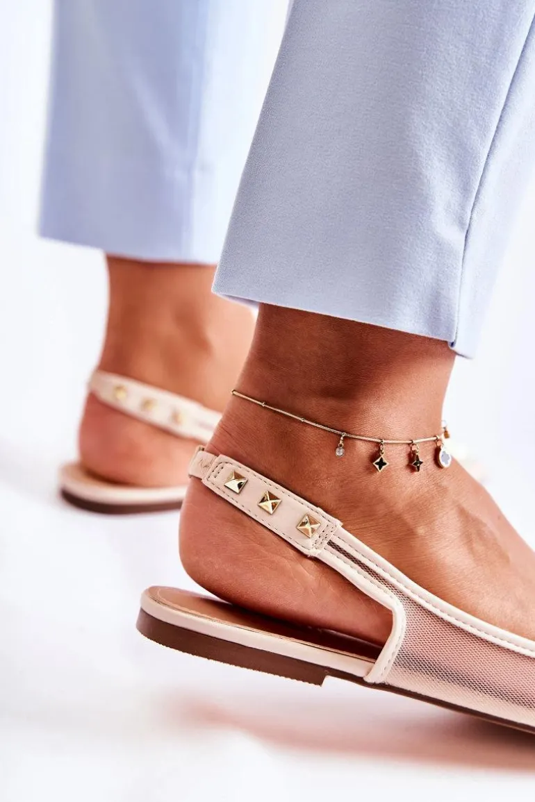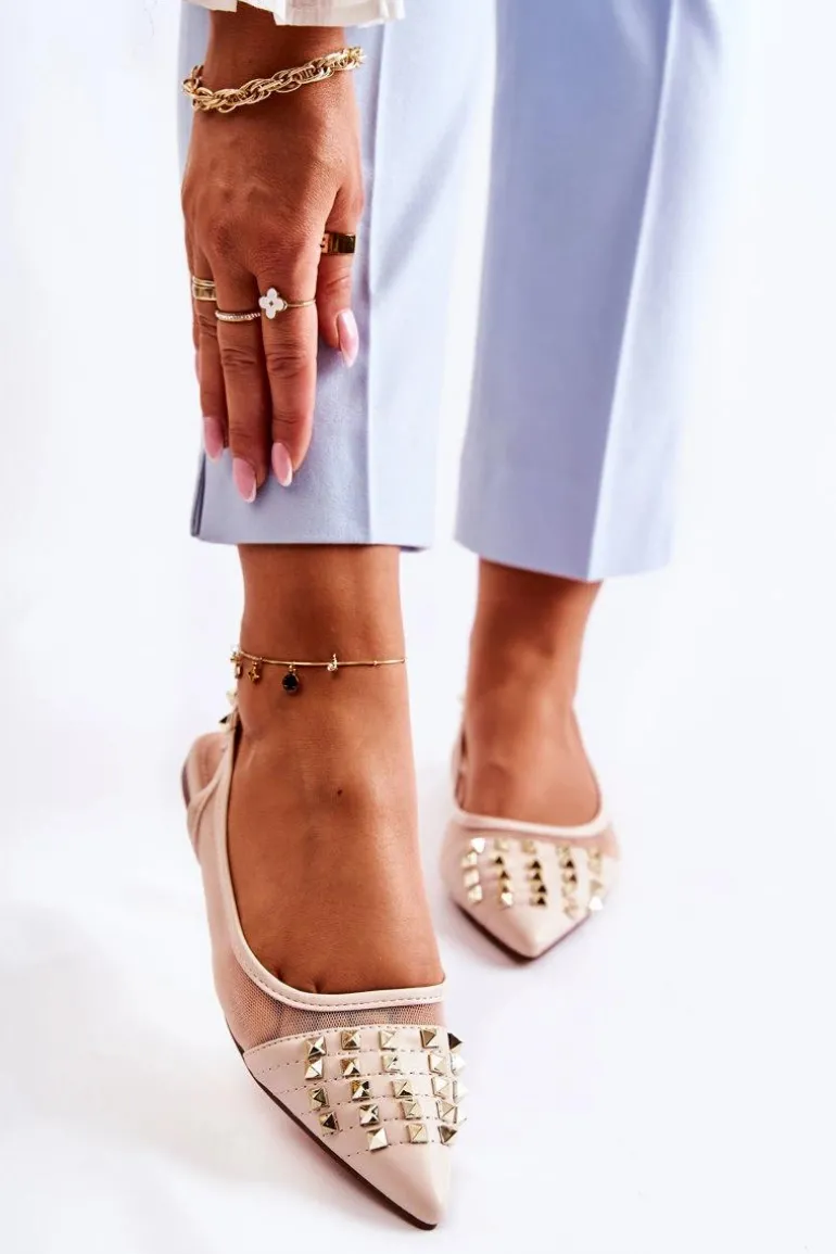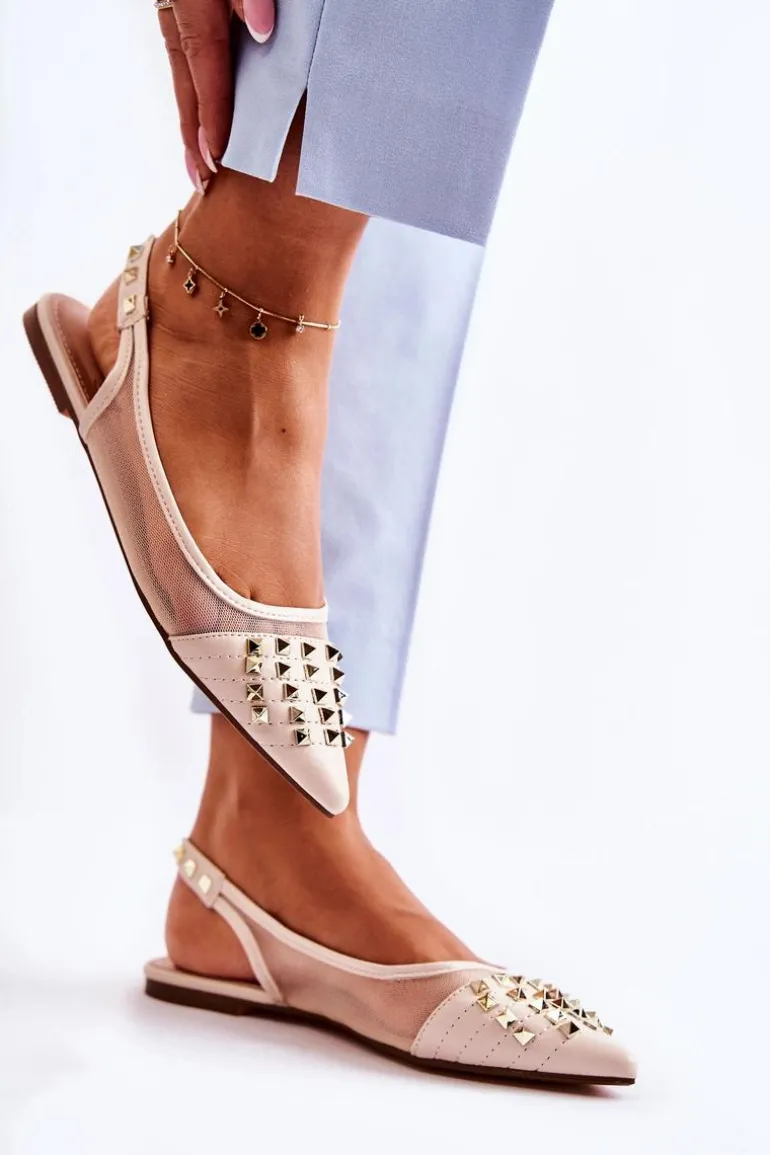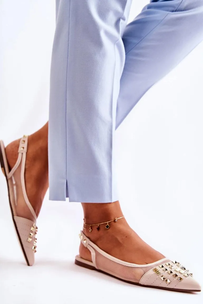 Modne baleriny z odkrytą piętą zostały wykonane z połączenia eko skóry oraz przewiewnego materiału. Wszyta gumka ułatwia zakładanie oraz sprawia, że buty są lepiej dopasowane do stopy. Miękka, eko skórzana wkładka zapewni komfort podczas użytkowania. Osadzone na niskim obcasie. Przód przyozdobiony ćwiekami z noskiem w szpic. Koniecznie sprawdź całą naszą kolekcję balerinek! Podczas wyboru rozmiaru prosimy sugerować się tabelą rozmiarów.