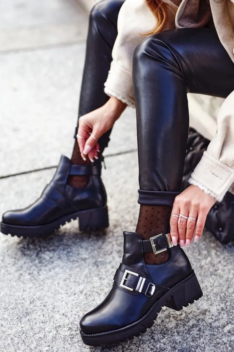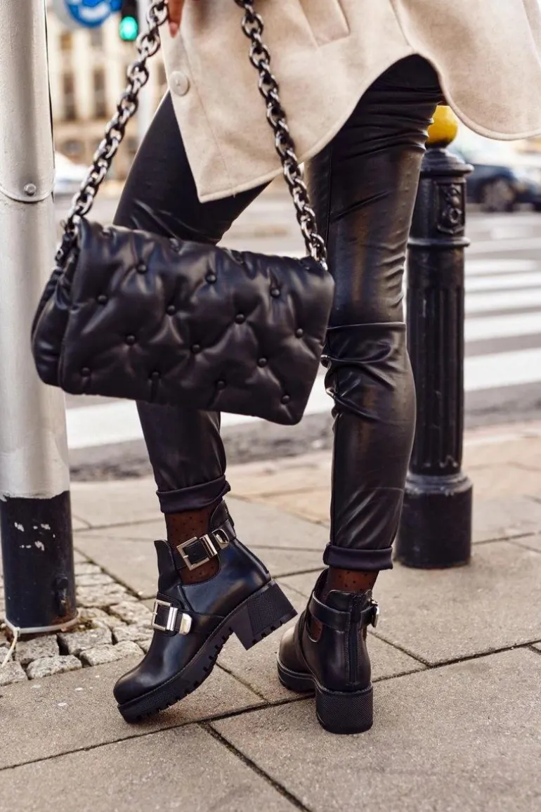 Ekskluzywne botki damskie! Wykonane ze skóry ekologicznej, ozdobione klamrami. Zapinane na zamek. Osadzone na delikatnym obcasie, który uniesie Twoją sylwetkę. Spraw sobie odrobinę nietuzinkowego look’u!