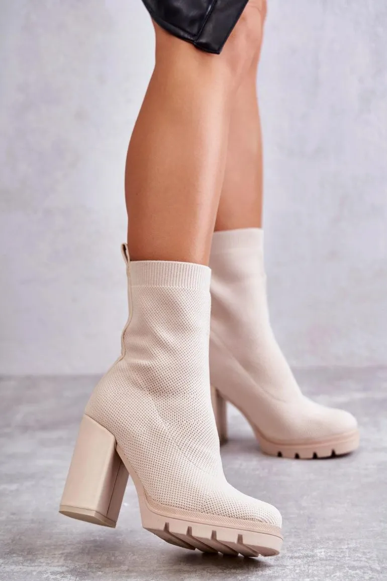 Modne botki z elastyczną cholewką za kostkę wykonaną z materiału. Na wysokości stopy są ocieplane kocem obuwniczym. Osadzone na obcasie w postaci masywnego słupka oraz platformie ze żłobieniami. Zapiętek jest usztywniany. Model ten świetnie będzie prezentować się zarówno z sukienkami, jak i jeansami. Dodatkowo buty posiadają bootstrapa, czyli pętelkę ułatwiającą zakładanie i ściąganie obuwia. Przy wyborze rozmiaru prosimy sugerować się tabelą rozmiarów.