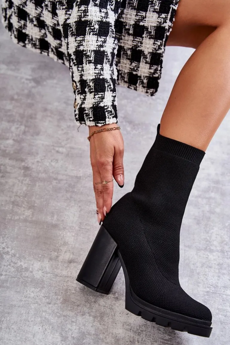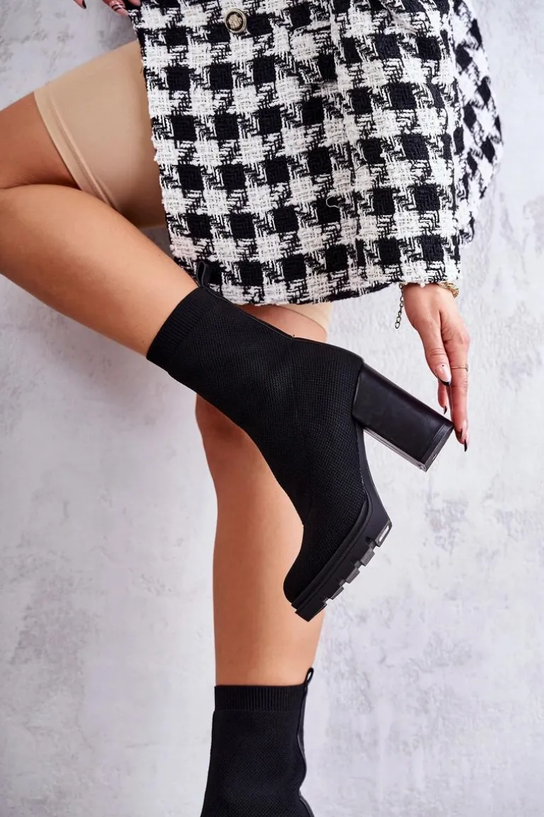 Modne botki z elastyczną cholewką za kostkę wykonaną z materiału. Na wysokości stopy są ocieplane kocem obuwniczym. Osadzone na obcasie w postaci masywnego słupka oraz platformie ze żłobieniami. Zapiętek jest usztywniany. Model ten świetnie będzie prezentować się zarówno z sukienkami, jak i jeansami. Dodatkowo buty posiadają bootstrapa, czyli pętelkę ułatwiającą zakładanie i ściąganie obuwia. Przy wyborze rozmiaru prosimy sugerować się tabelą rozmiarów.