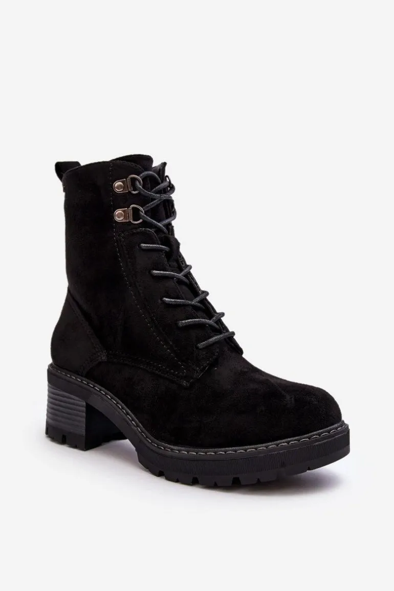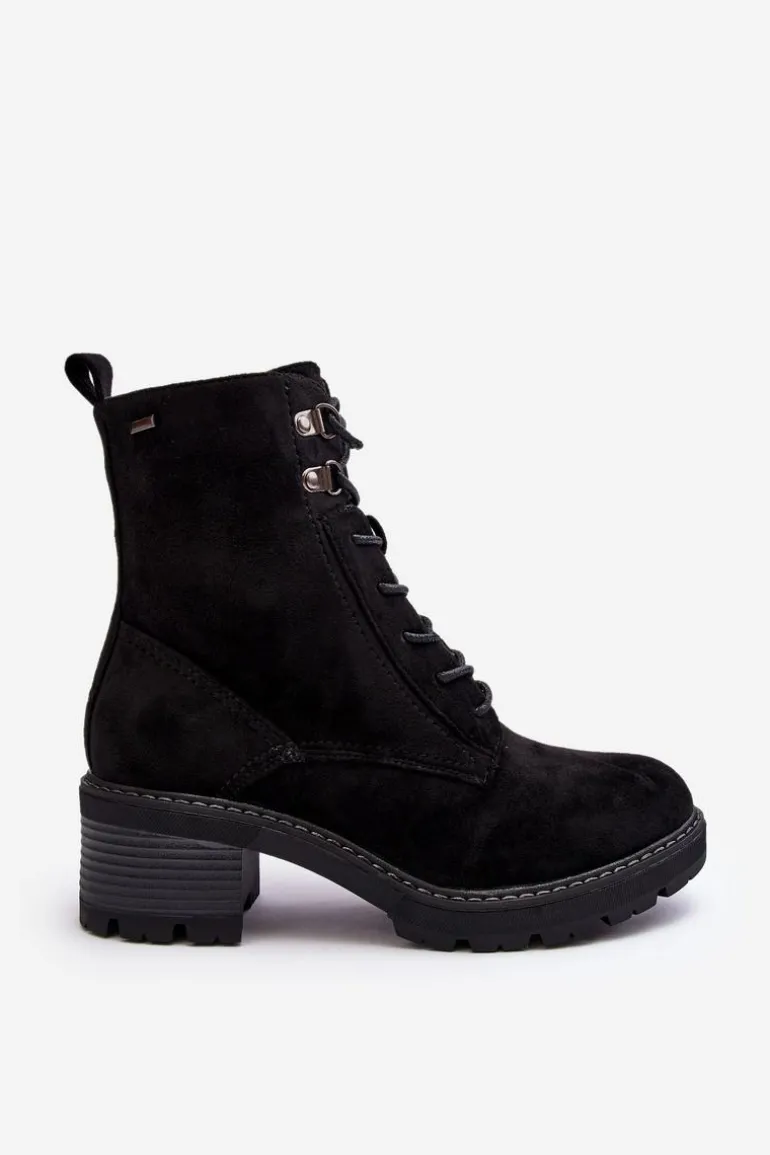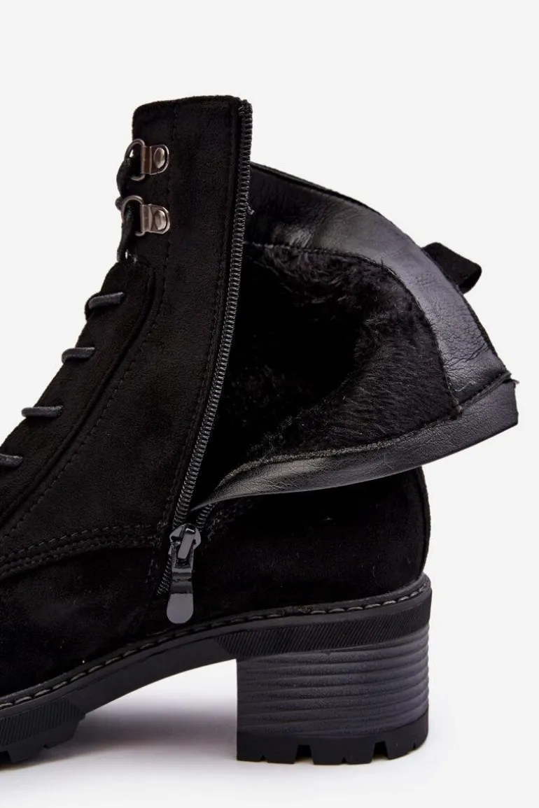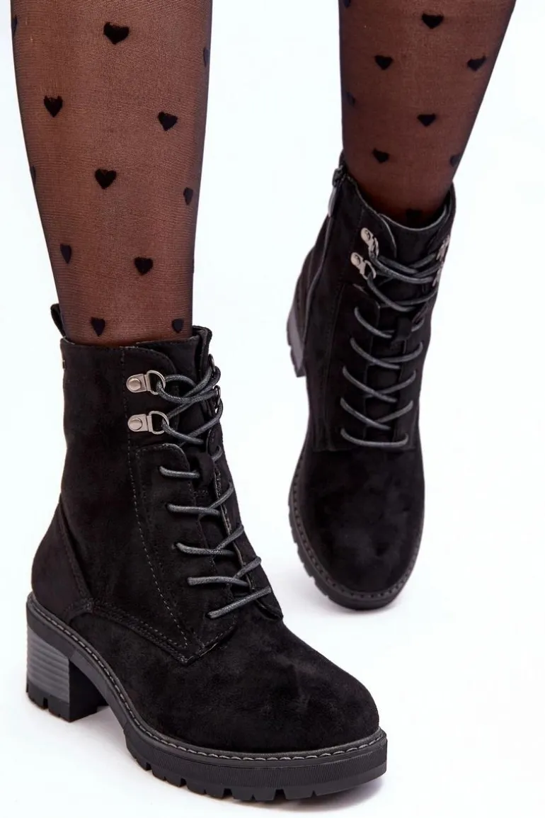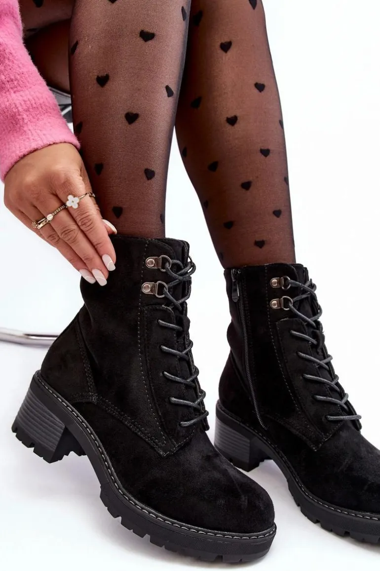 Botki damskie wykonane z eko zamszu. Osadzone na niskim, stabilnym obcasie. Zapinane z boku cholewki na suwak. Z przodu sznurowanie. Środek ocieplony kocem obuwniczym. Noski zaokrąglone. Model ten będzie idealnym uzupełnieniem jesienno-zimowych stylizacji! Przy wyborze rozmiaru prosimy sugerować się tabelą rozmiarów.