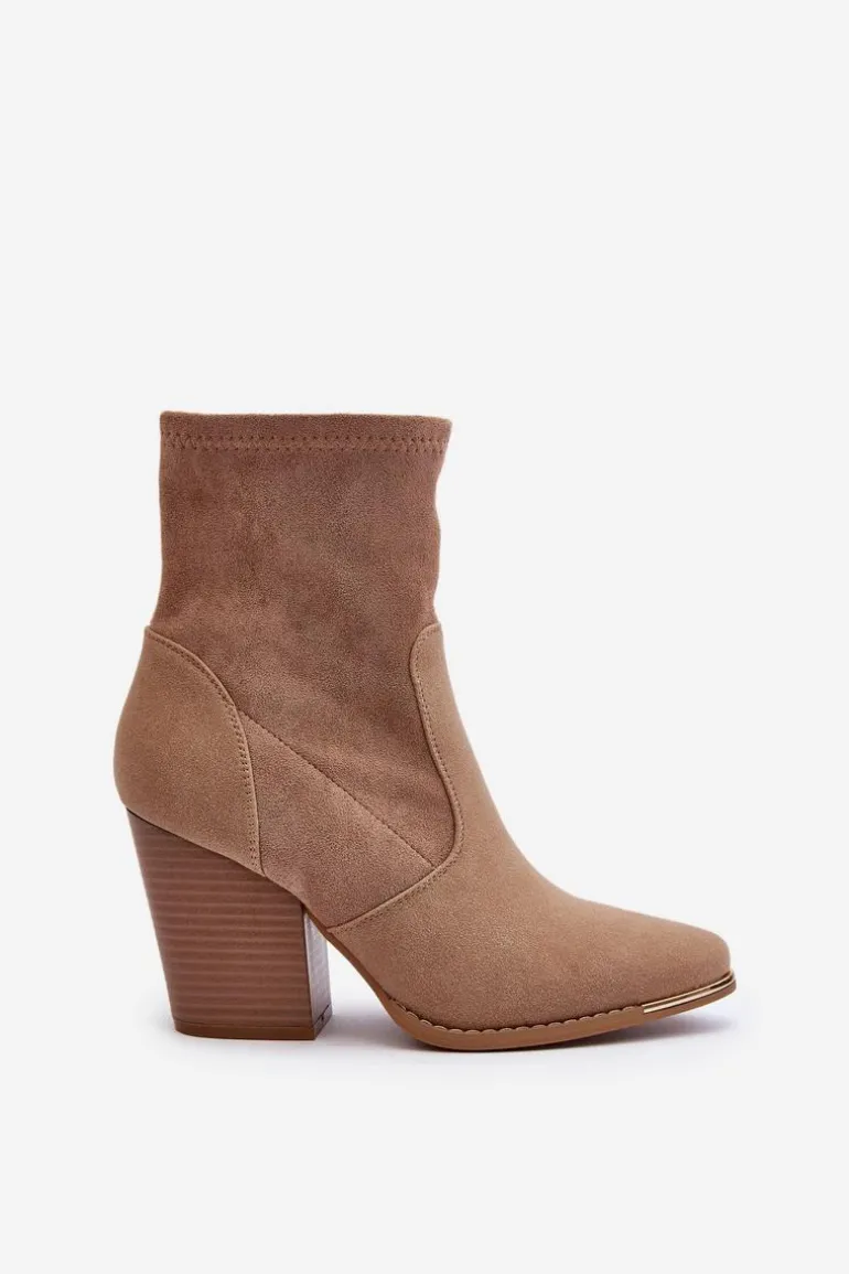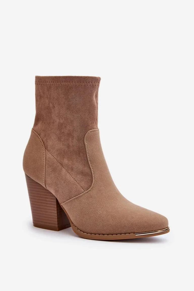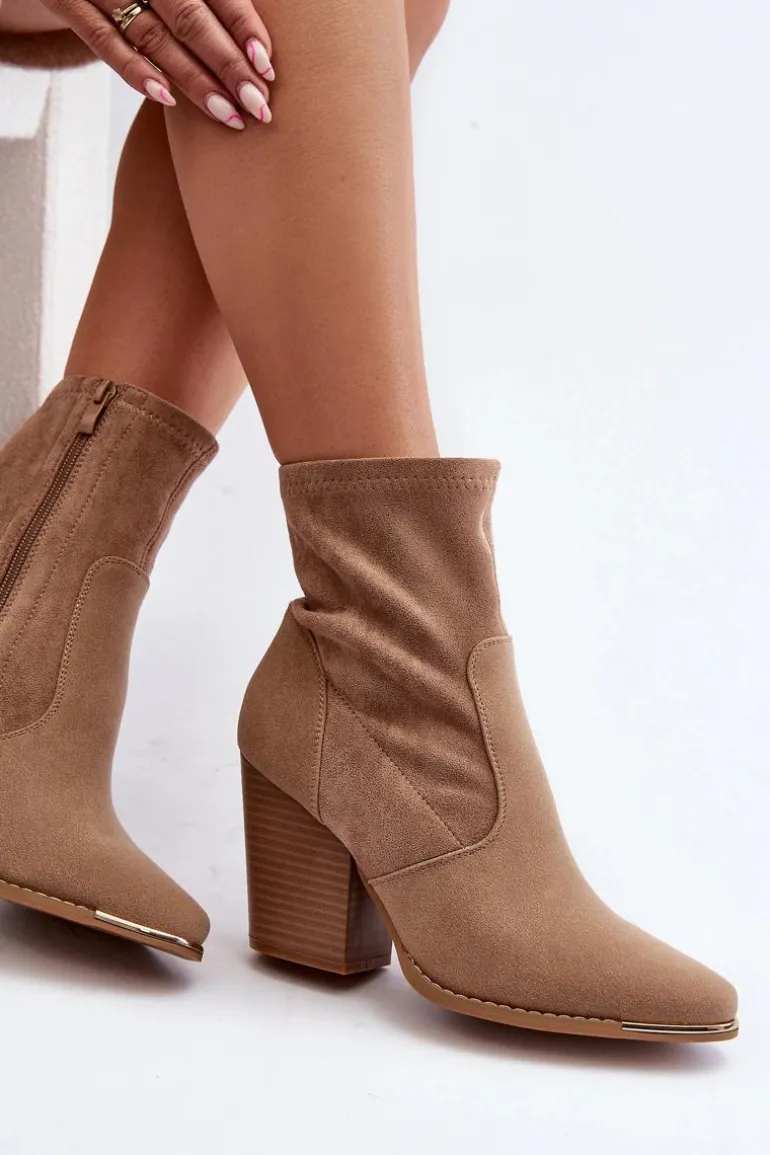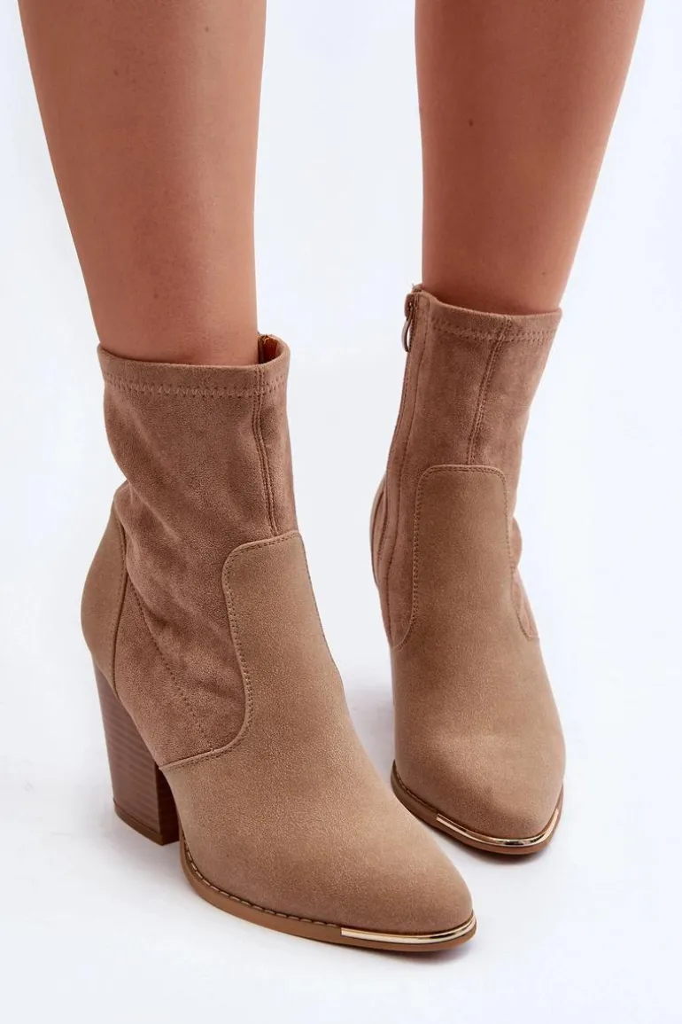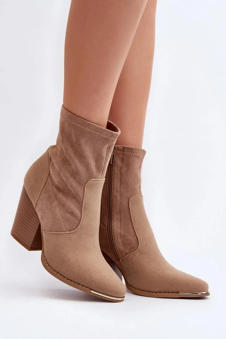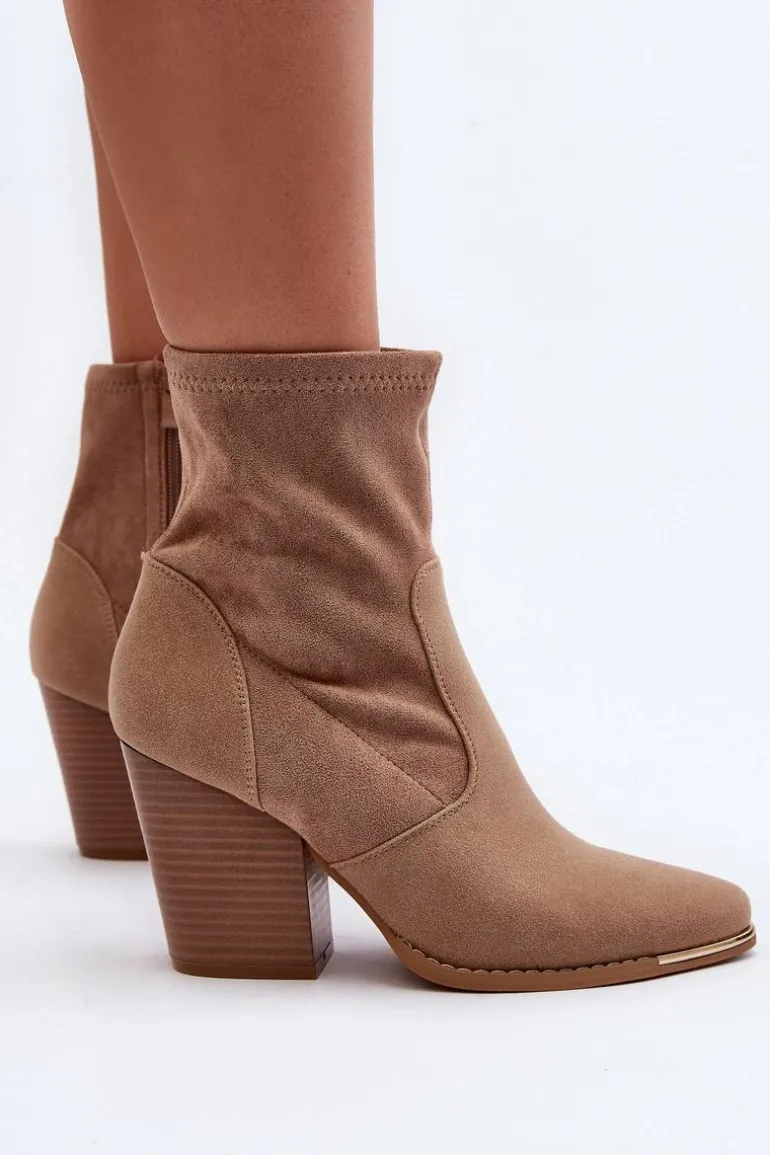 Botki damskie wykonane z eko zamszu. Osadzone na obcasie w postaci słupka. Zapinane na zamek. Cholewka za kostkę. Noski w migdał optycznie wysmuklą nogi. Model ten posiada lekkie ocieplenie kocem obuwniczym na wysokości stopy. Przy wyborze rozmiaru prosimy sugerować się tabelą rozmiarów.