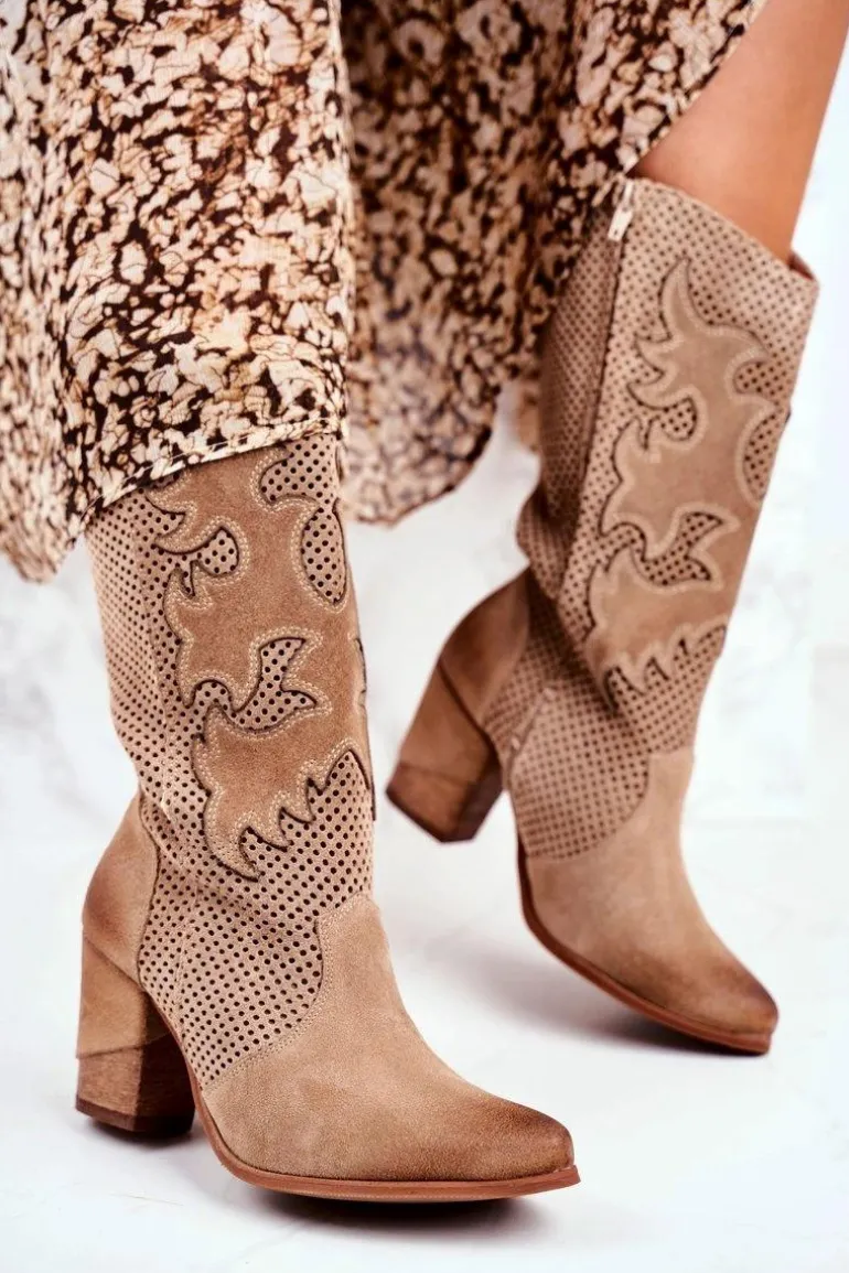 Damskie Botki Na Słupku Beżowe Skórzane Wysokie Rosemary