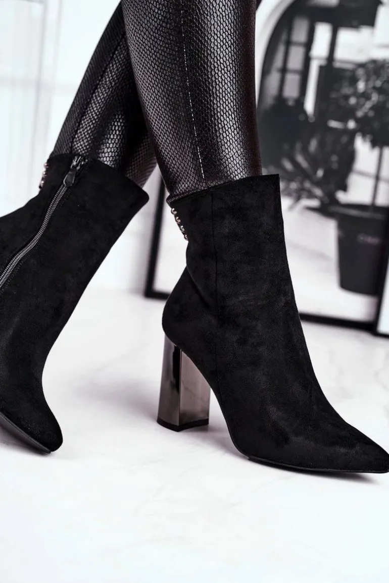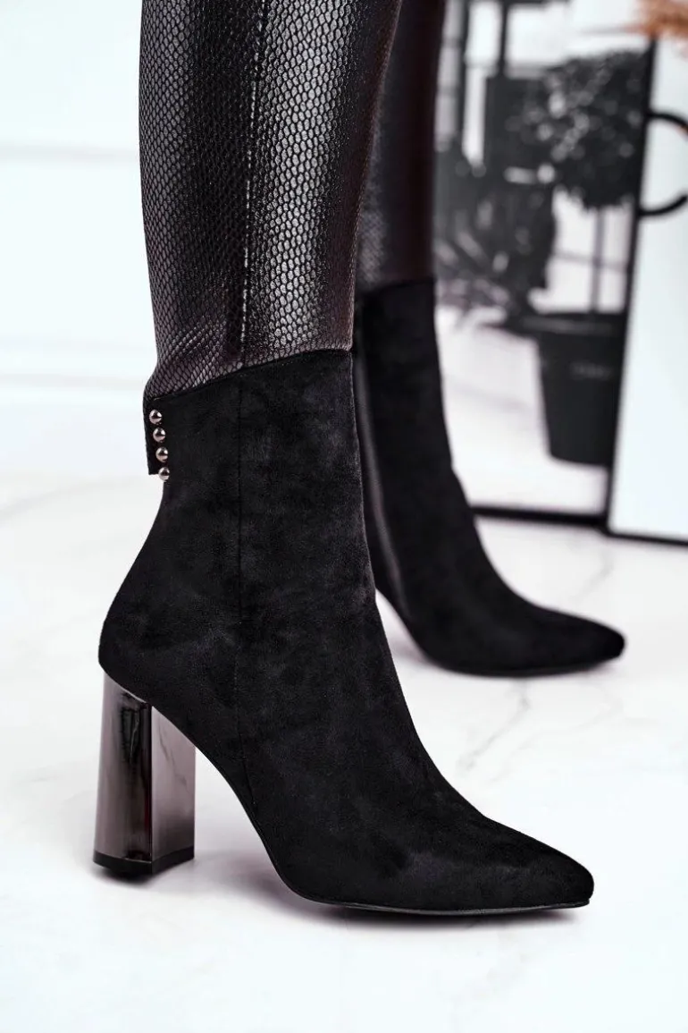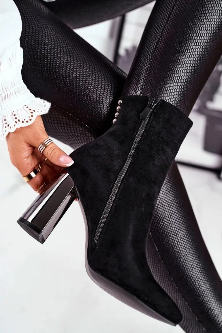 Czarne botki wykonane z przyjemnego w dotyku ekozamszu i lustrzanym obcasem to nasza nowość. Stabilny słupek oraz rozpięcie zamkiem zapewni komfort użytkowania. Rozporek w cholewce dopasowuje się do każdej tęgości, dzięki czemu będzie to doskonały wybór na jesienne czy wiosenne użytkowanie. Przy wyborze rozmiaru prosimy sugerować się tabelą rozmiarów.
