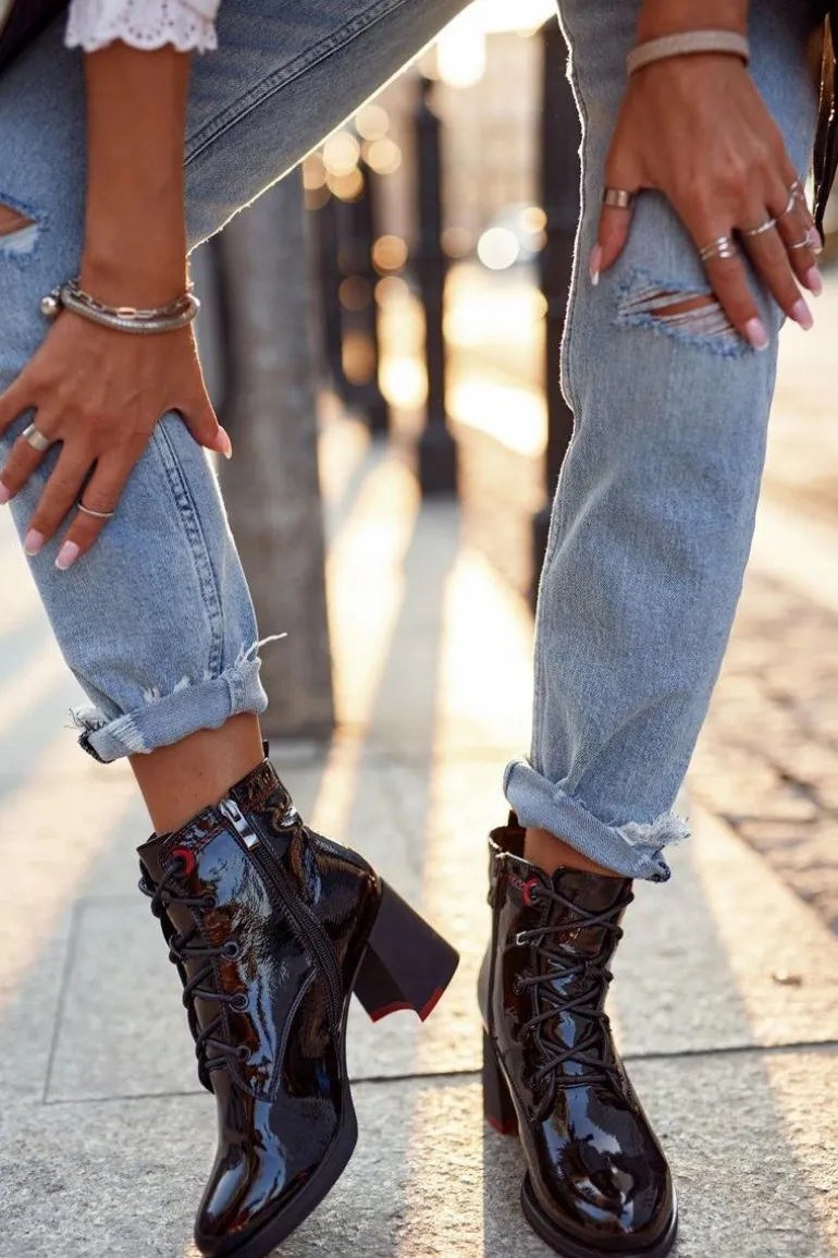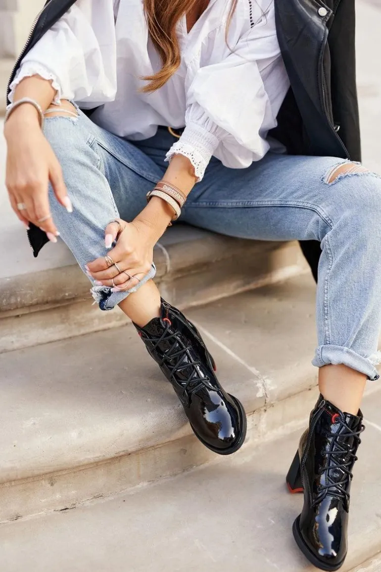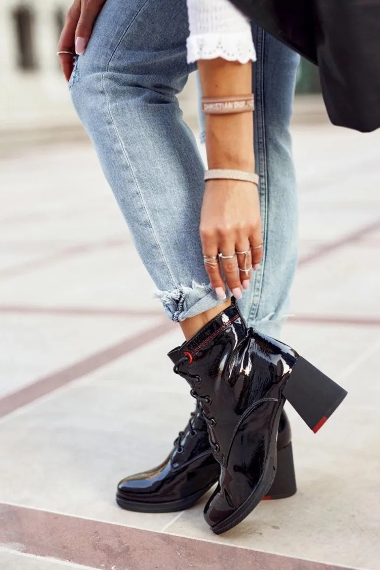 Marzyłaś o kolejnej parze butów, która zachwyci wszystkich dookoła? Jeśli tak to nie musisz już szukać dalej. Klasyczny krój na słupku nigdy nie wyjdzie z mody, a połączenie go z lakierowaną skórą ekologiczną to po prostu strzał w 10! Botki posiadają zamek błyskawiczny ułatwiający zakładanie oraz klasyczne sznurowanie dla jeszcze lepszego dopasowania. W chłodnie dni nie musisz się martwić co założyć, ponieważ botki wewnątrz posiadają delikatne ocieplenie w postaci koca obuwniczego. Przy wyborze rozmiaru prosimy sugerować się tabelą rozmiarów.