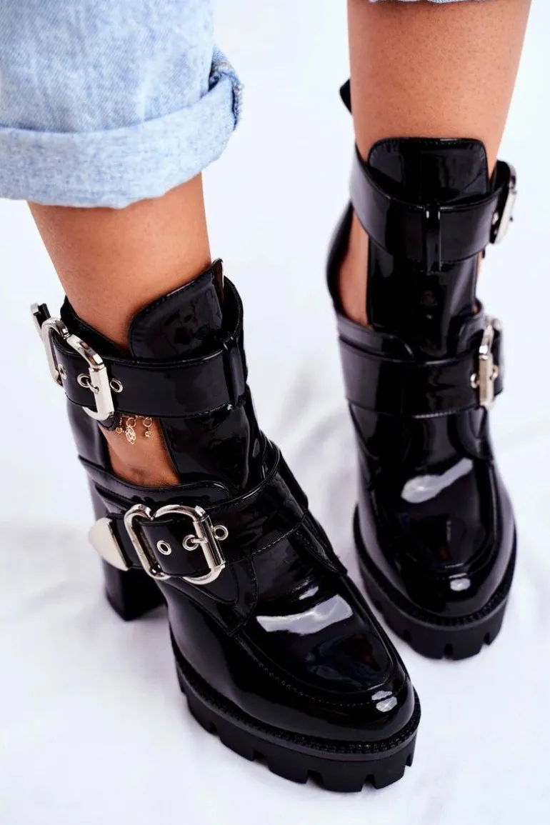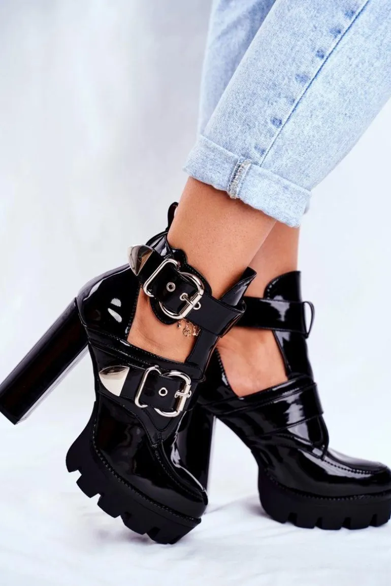 Ekskluzywne damskie botki w nieco mocniejszej wersji! Zapinanie na dwie duże srebrne klamry, wysoki słupek oraz 3,5cm platforma a to wszystko opakowanie w pięknym lakierowanym czarnym kolorze <3 Spraw sobie odrobinę nietuzinkowego look'u i pokaż wszystkim kto tu rządzi! Przy wyborze rozmiaru prosimy sugerować się tabelą rozmiarów.