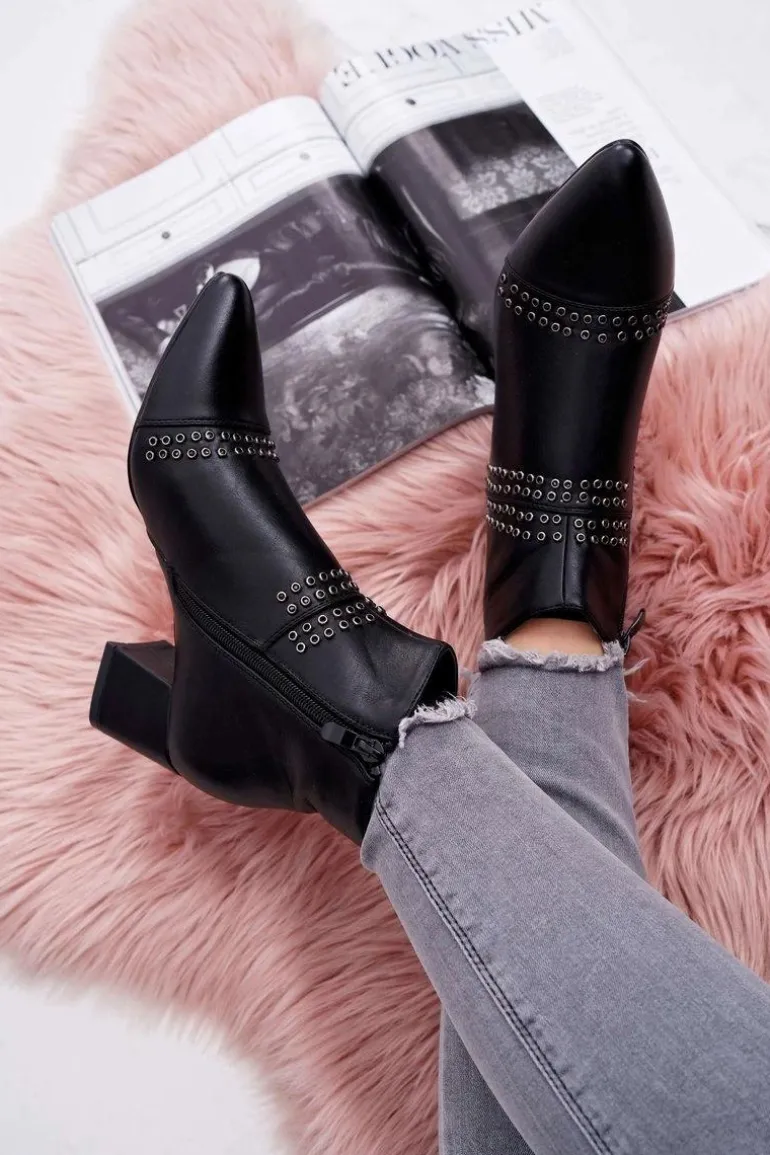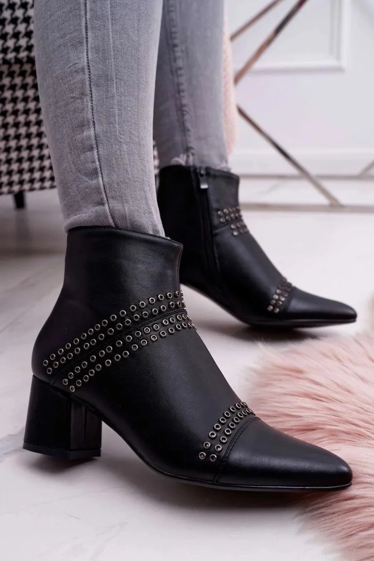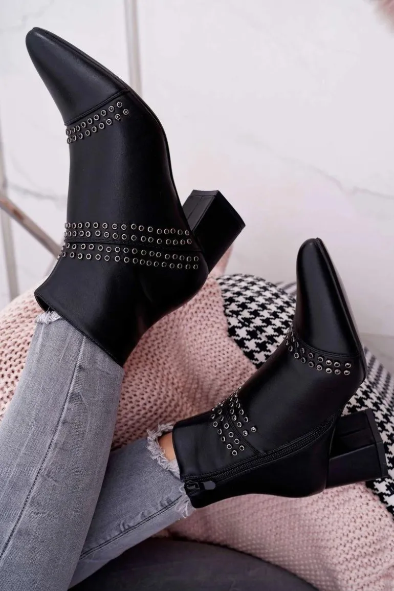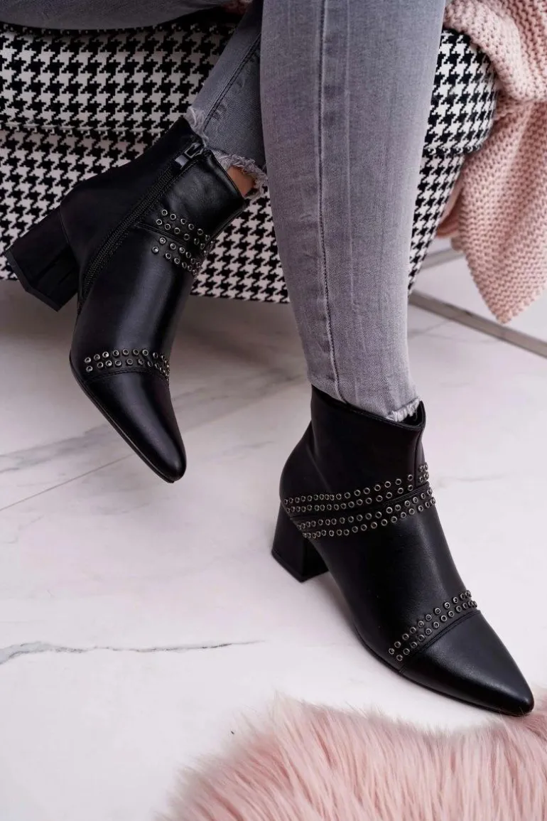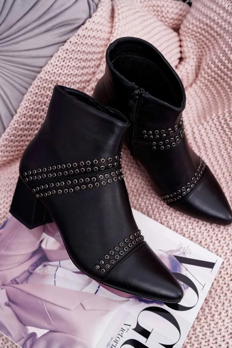 Damskie Botki Na Słupku W Szpic Z Nitami Czarne Primma