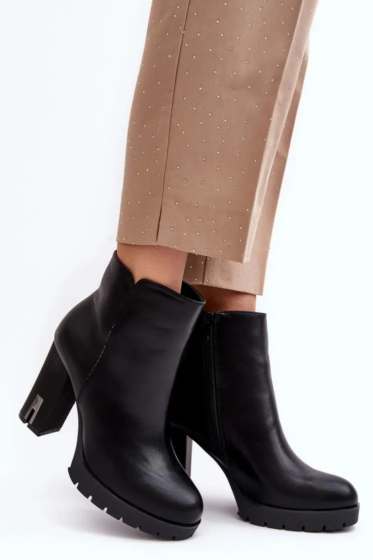 Damskie botki wykonane z eko skóry. Osadzone na platformie i obcasie w postaci słupka. Model ten zapinany jest na suwak z boku cholewki. Noski zaokrąglone. Usztywniony zapiętek. Miękka wkładka zapewni komfortowe użytkowanie obuwia. Idealne do jesiennych stylizacji! Przy wyborze rozmiaru prosimy sugerować się tabelą rozmiarów.