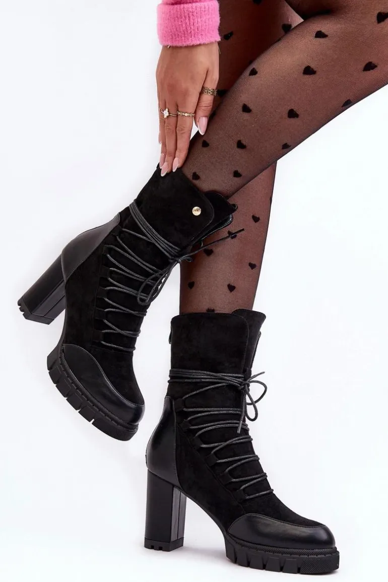 Damskie botki osadzone na platformie i masywnym obcasie w postaci słupka. Wykonane z połączenia eko skóry i eko zamszu. Z tyłu cholewki suwak. Ocieplone kocem obuwniczym w środku. Noski zaokrąglone. Zapiętek usztywniony. Koniecznie musisz je mieć! Przy wyborze rozmiaru prosimy sugerować się tabelą rozmiarów.