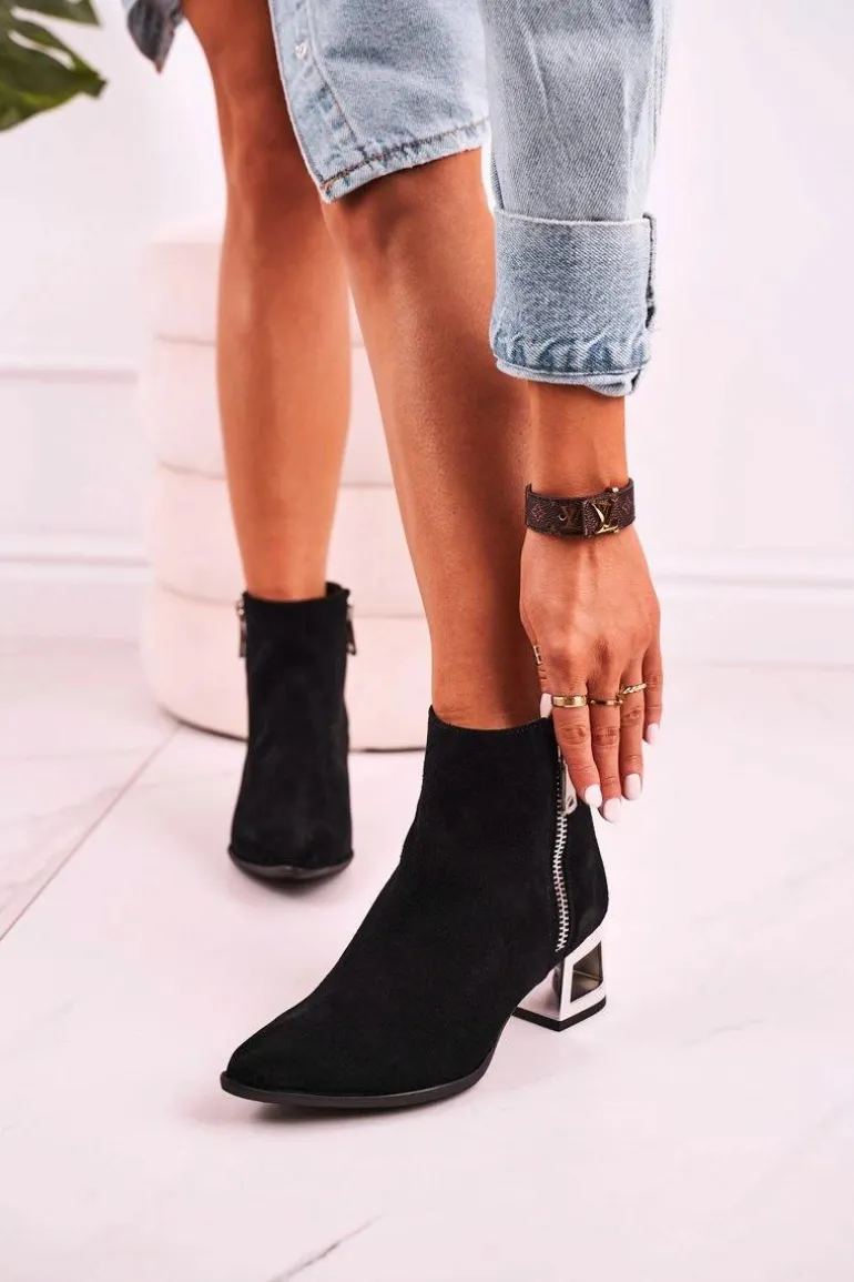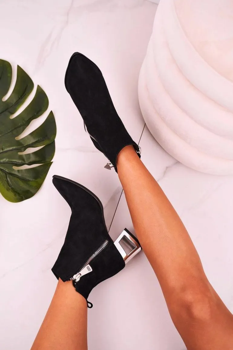 Damskie Botki Na Srebrnym Obcasie Zamszowe Czarne Norah