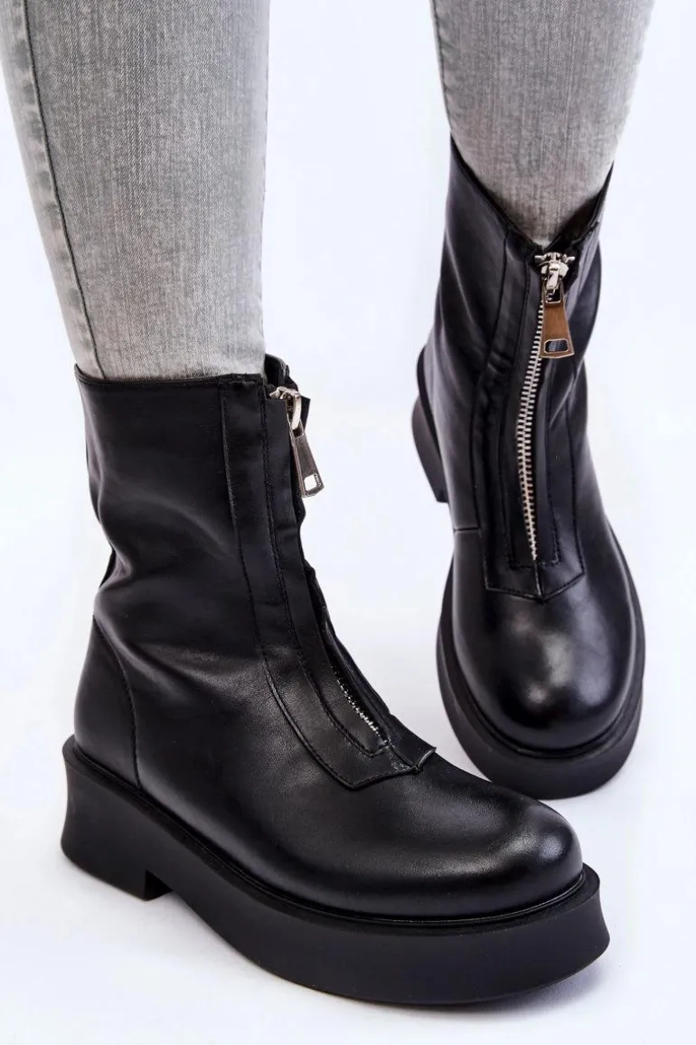 Klasyczne, damskie botki zostały wykonane z eko skóry. Posiadają usztywniany zapiętek. Osadzone na płaskim obcasie i masywnej platformie. Zapinane z przodu na suwak. Model za kostkę świetnie sprawdzi się w wielu stylizacjach. Wyściółka materiałowa. Koniecznie powinnaś mieć ten model w swojej szafie! Przy wyborze rozmiaru prosimy sugerować się tabelą rozmiarów.