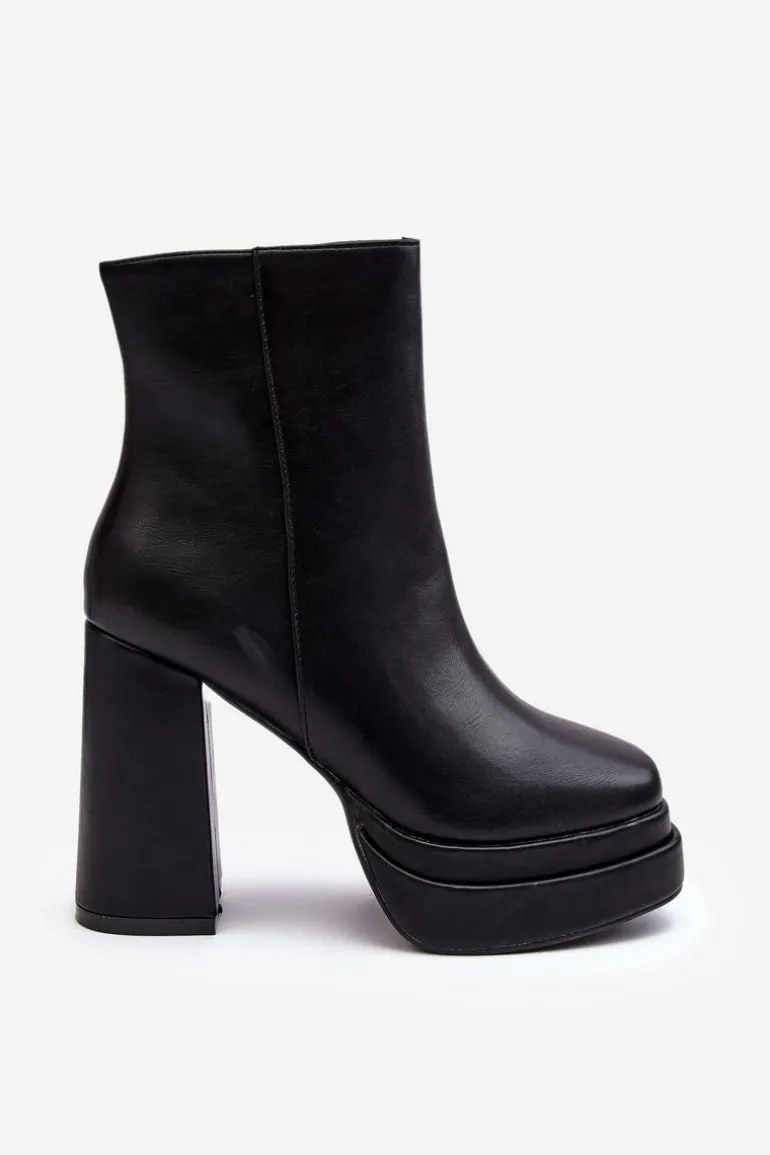 Masywne botki damskie wykonane z eko skóry. Osadzone na wysokim obcasie w postaci słupka i platformie. Noski w kwadrat. Zapiętek jest usztywniony. Model ten zapinany jest na suwak z boku. Botki te doskonale sprawdzą się w jesiennych stylizacjach. Przy wyborze rozmiaru prosimy kierować się tabelą rozmiarów