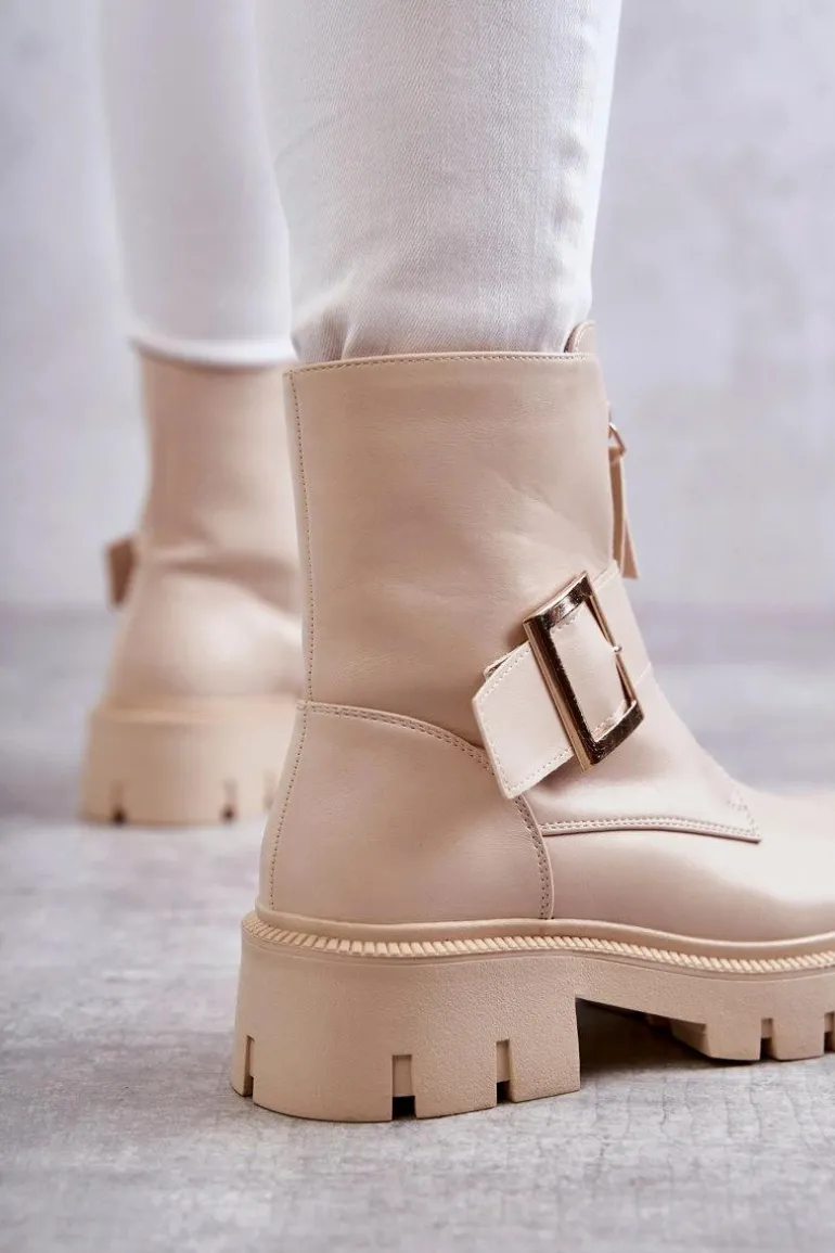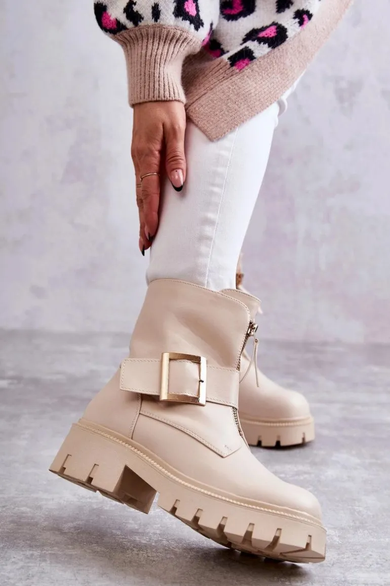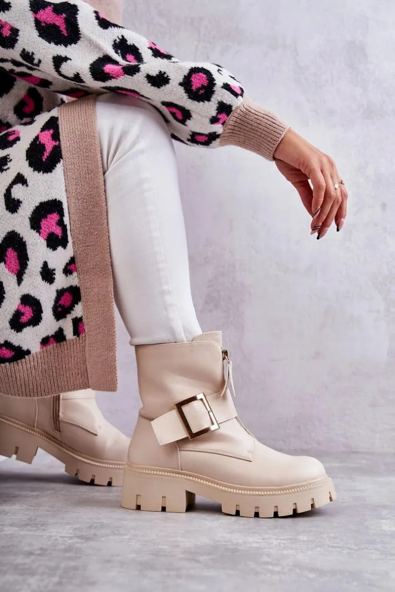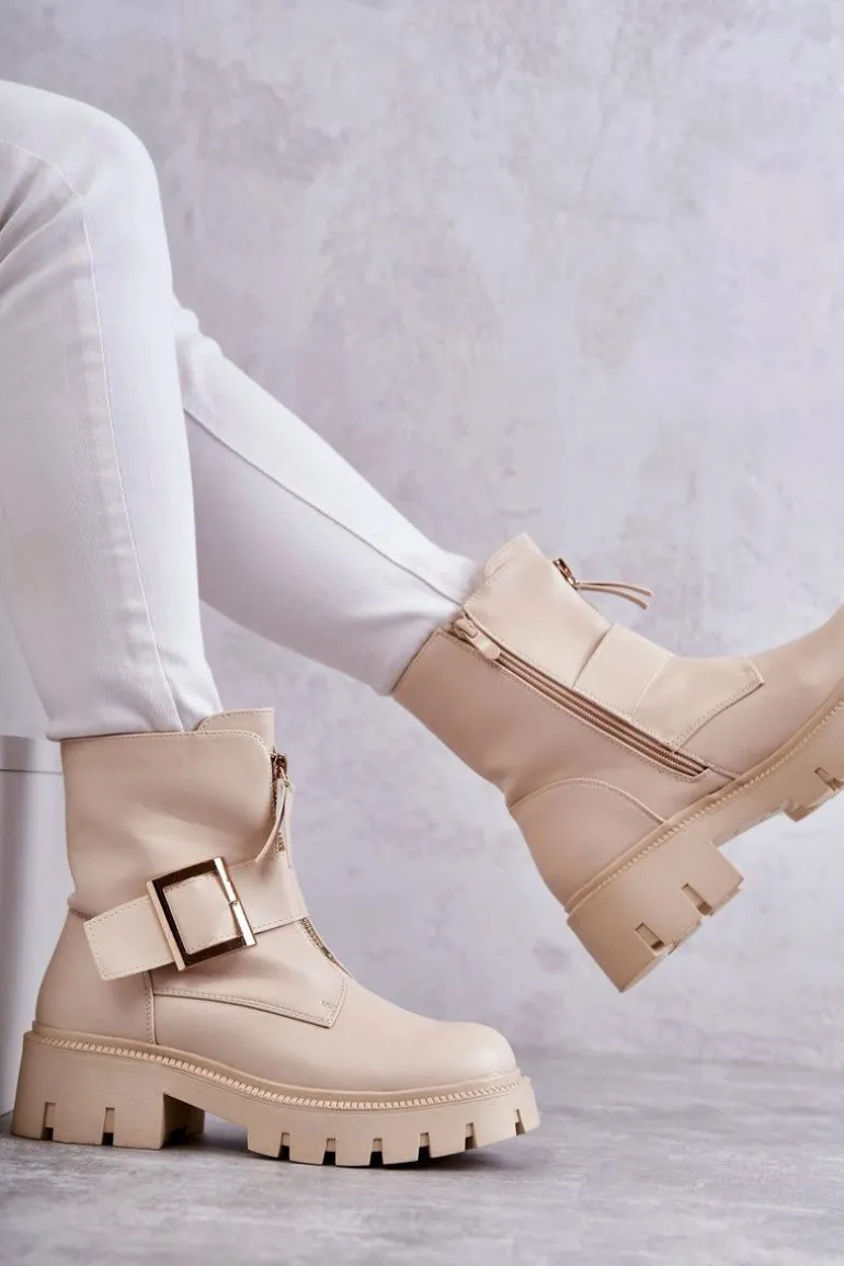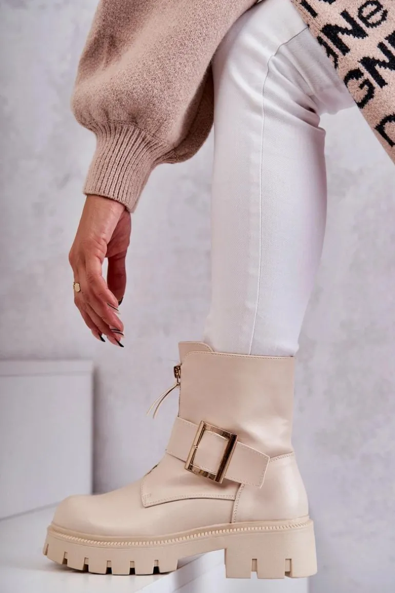 Modne botki damskie zostały wykonane z eko skóry. Model ten posiada usztywniany zapiętek. Zamykane na suwak. Dodatkowo botki posiadają ozdobną klamrę z boku cholewki oraz ozdobny suwak na przodzie. Osadzone na płaskim obcasie oraz platformie. Nosek zaokrąglony. Koniecznie sprawdź pozostałe modele płaskich botków! Przy wyborze rozmiaru prosimy sugerować się tabelą rozmiarów.