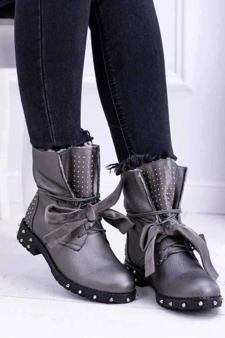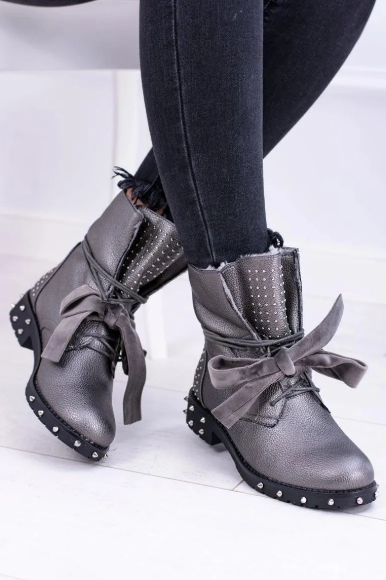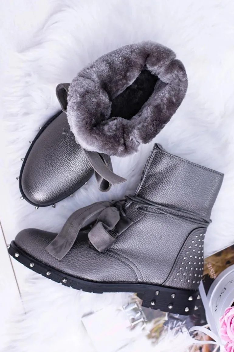 Damskie Botki Ocieplane Z Kolcami i Dżetami Srebrne Neso