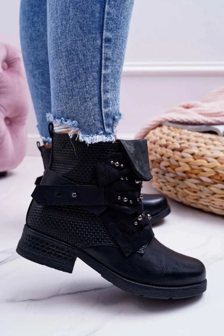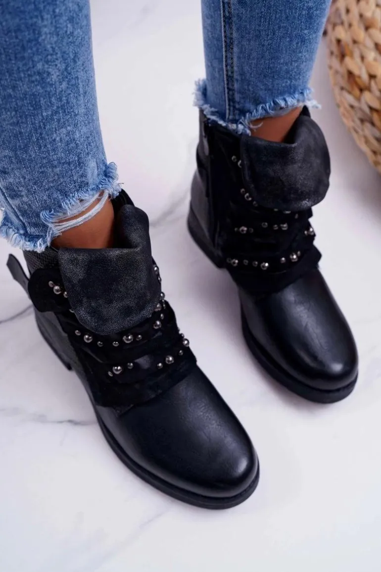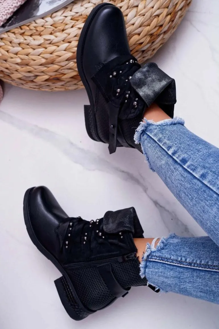 Damskie Botki Płaski Obcas Ciepłe Czarne Debra