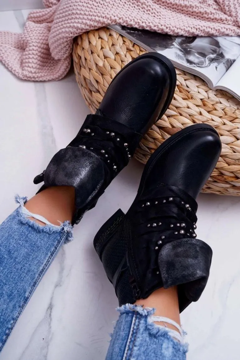 Niezwykle wygodne i modne botki. Klasyczny wzór zdobiony srebrnymi dżetami na cholewce. Botki oparte na płaskim obcasie, który świetnie wkomponuje się w wiele stylizacji. W środku ocieplenie w postaci koca obuwniczego. Zapinane na zamek. Przy wyborze rozmiaru prosimy sugerować się tabelą rozmiarów.