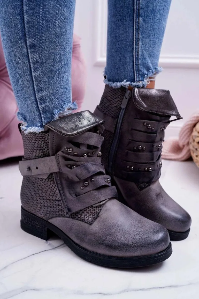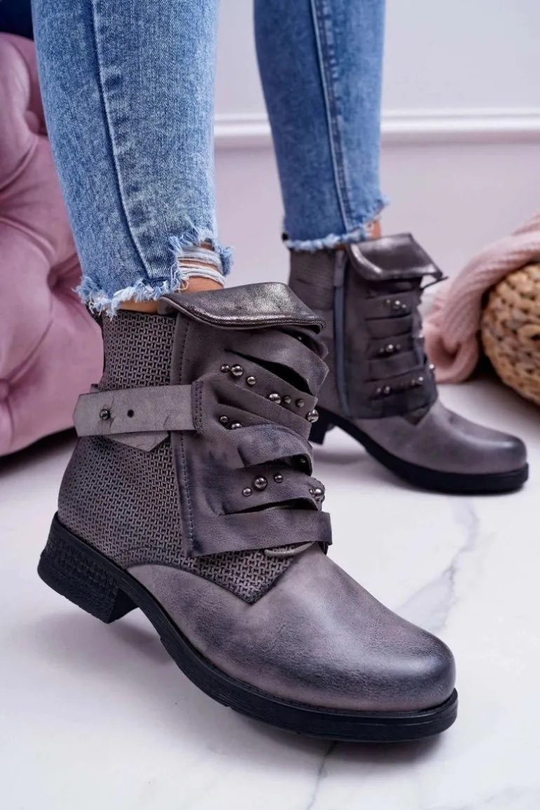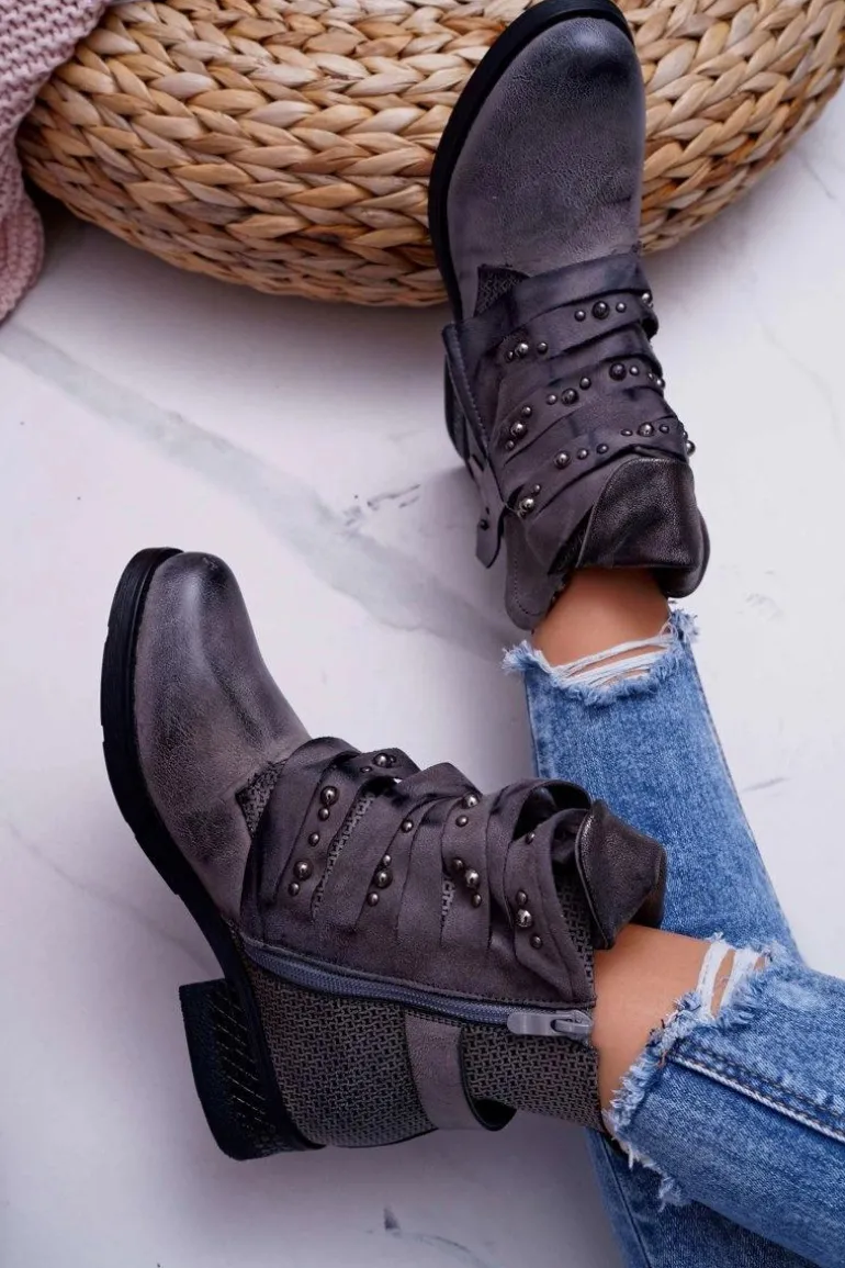 Damskie Botki Płaski Obcas Ciepłe Szare Debra