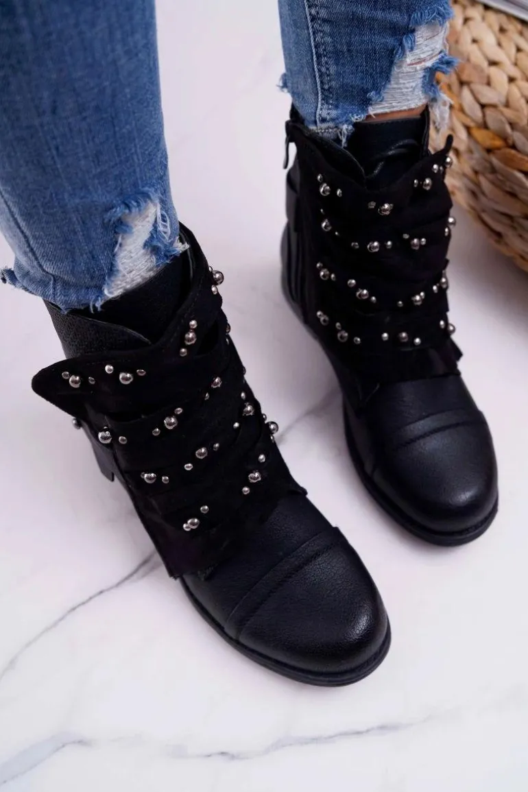 Damskie Botki Płaski Obcas Z Dżetami Czarne Valko