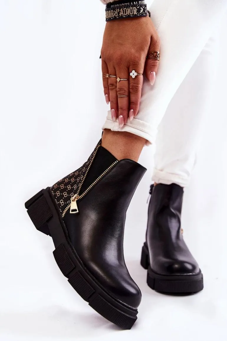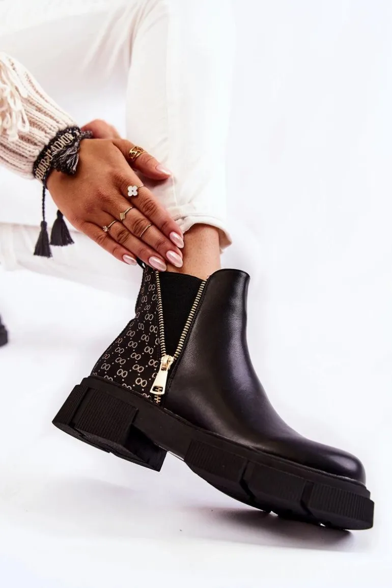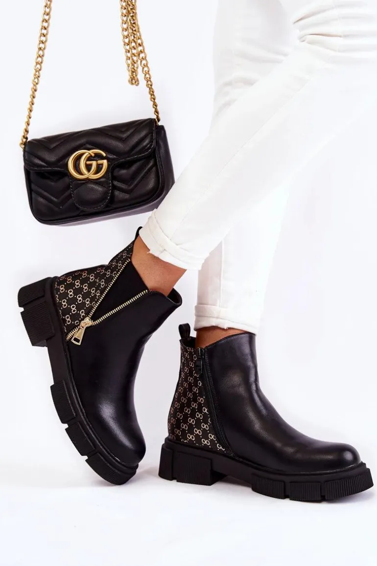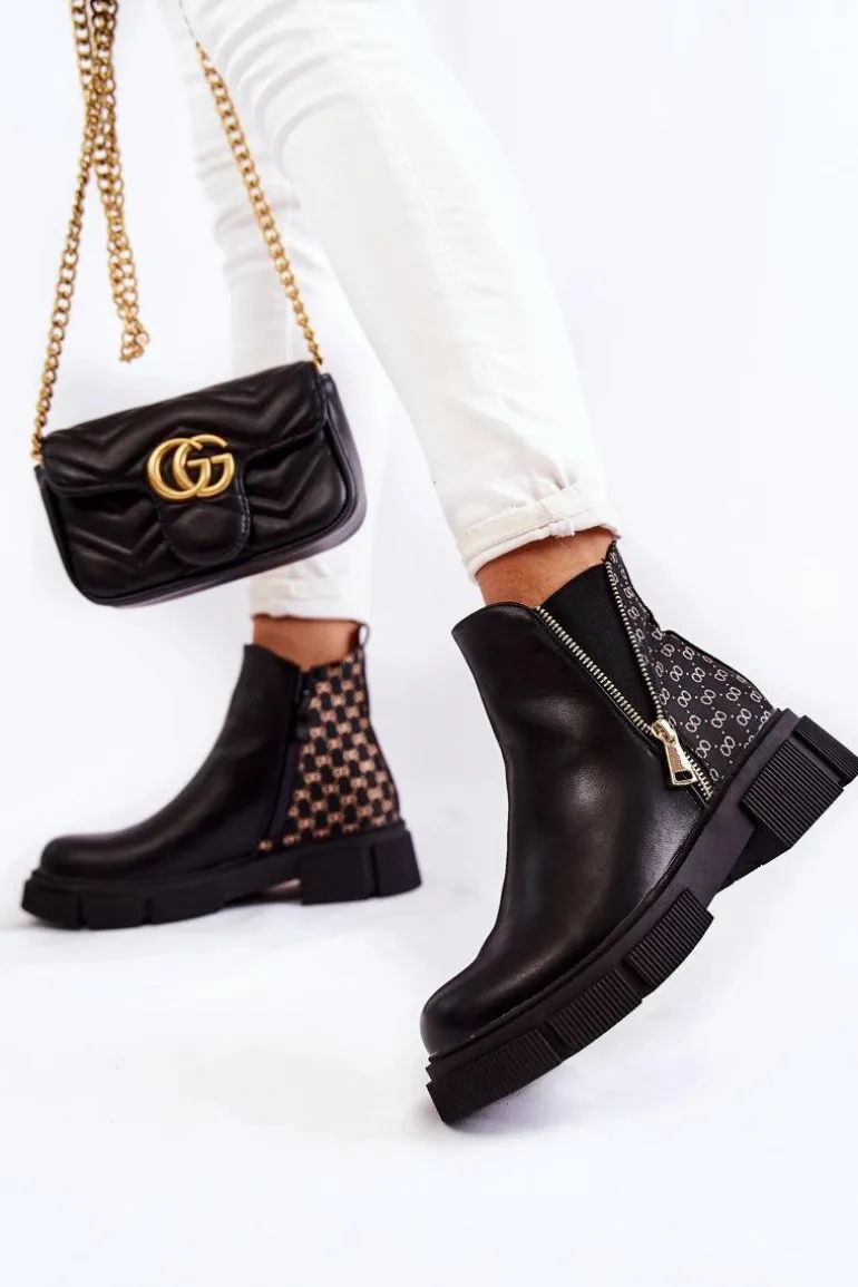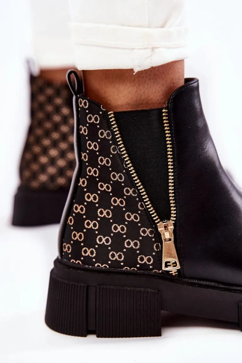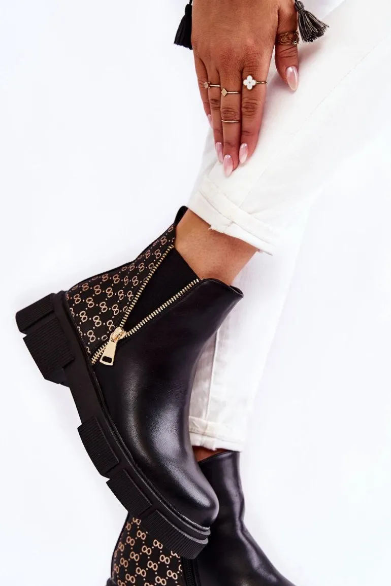 Świetne botki damskie wykonane z połączenia eko skóry oraz tkaniny z ozdobnym wzorem. Model z dwoma suwakami po bokach cholewki. Botki zostały osadzone na platformie i płaskim obcasie ze żłobieniami. Dodatkowo zapiętek jest usztywniany. Botki nie posiadają ocieplenia. Eko skórzana wkładka zapewni wygodę podczas użytkowania. Przy wyborze rozmiaru prosimy sugerować się tabelą rozmiarów.